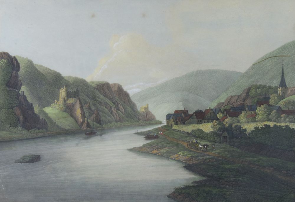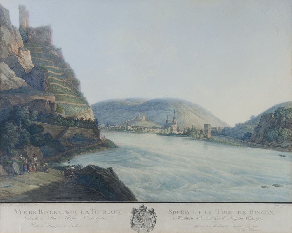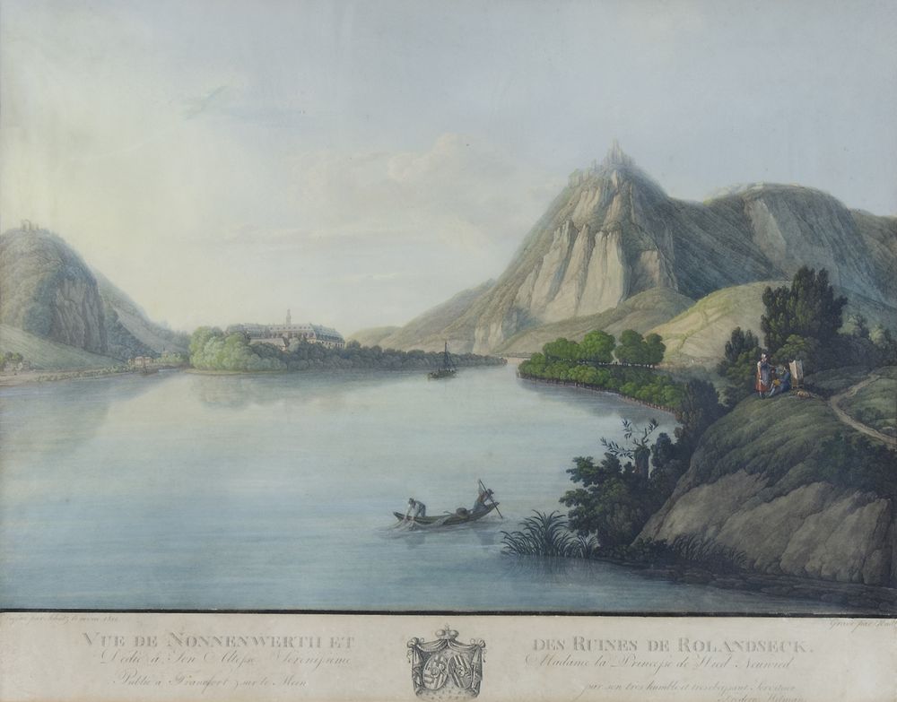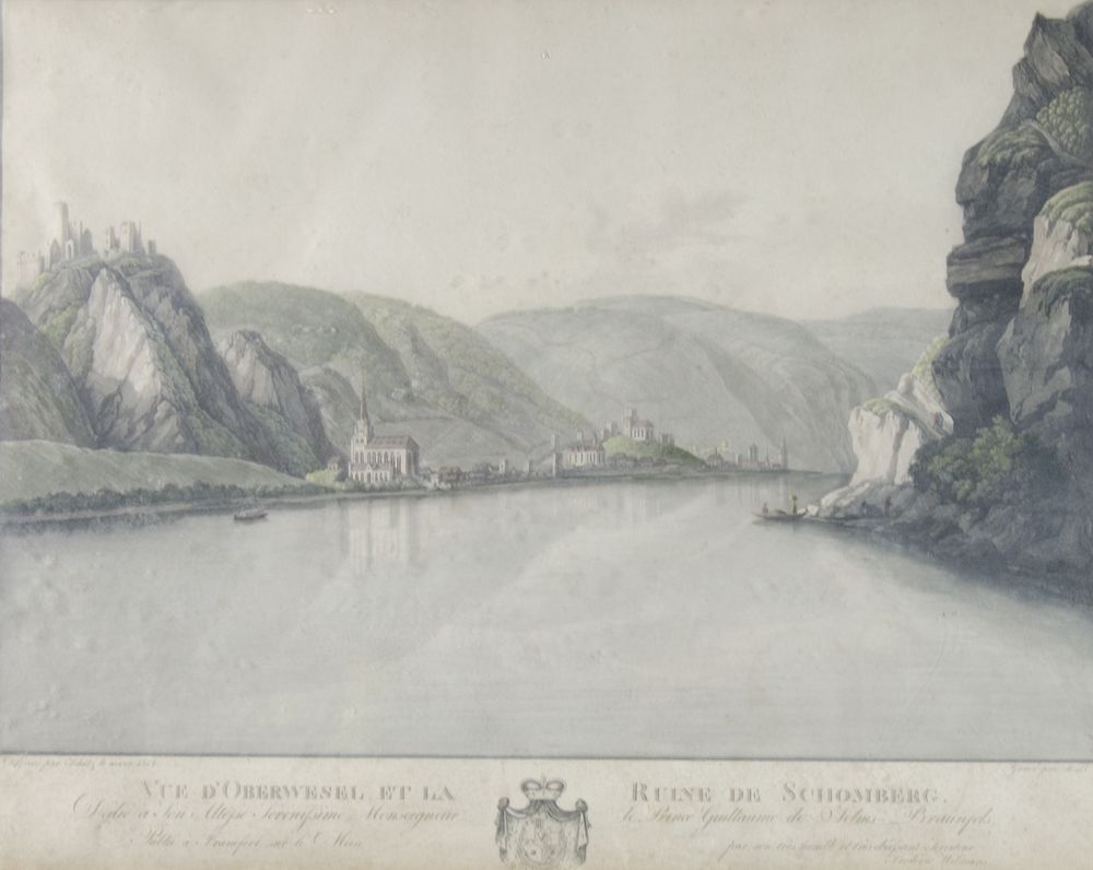 Lotto di 4 grandi incisioni a colori raffiguranti vedute del Reno. Incorniciate.