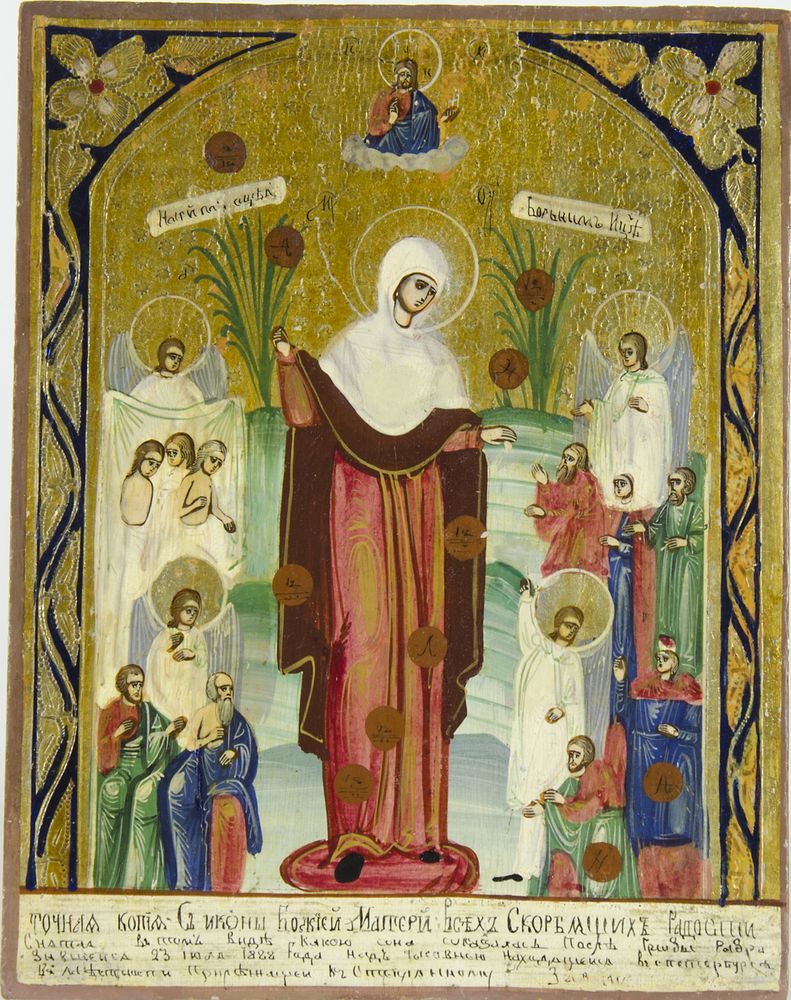 Icona dipinta su tavola raffigurante Madonna con Santi. XX secolo. cm. 22x17.