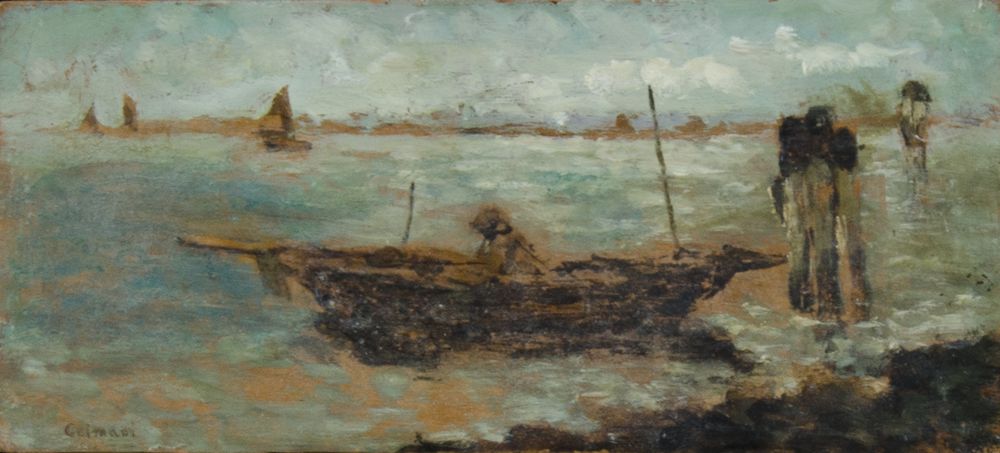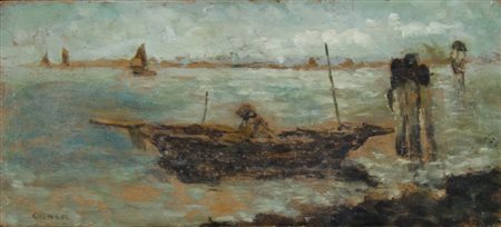Guido Grimani Trieste 1871-1933 "Piccola marina" cm. 10x21- olio su tavoletta Firmato b. a s.