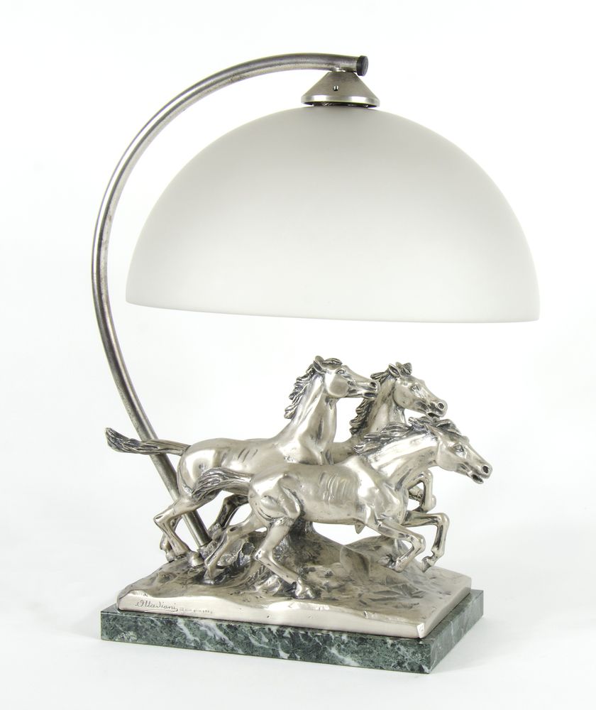 Lampada da tavolo in argento rinforzato con figure di cavalli e paralume in vetro, base in marmo. Firmata Ottaviani. H. cm. 42.