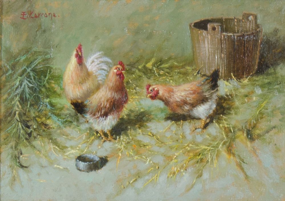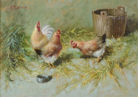 Eduardo Cerrone 1935-2011 "Galline" cm. 13x18 - olio su cartone Firmato alto...