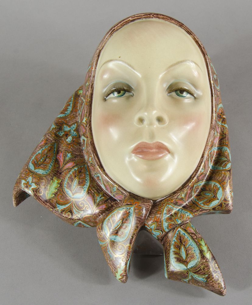 Lenci: scultura in ceramica policroma raffigurante viso di donna con scialle. Disegno di H. Konig Scavini 1939. Firmata Lenci made in Italy. H. cm. 32. Pubbl.: "Le ceramiche Lenci" a cura di A. Panzetta Allemandi Editore Torino, fig. 686.