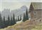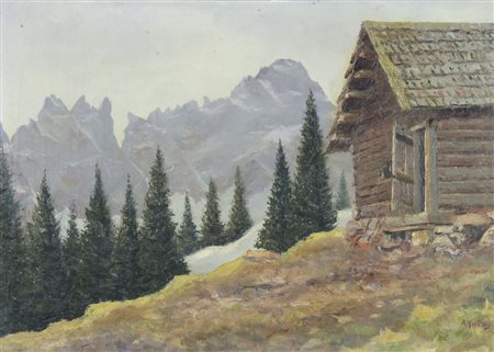 Pittore primi '900 Lotto di 2 oli su compensato cm. 39x55: a) "Montagne" b) "Baita" Entrambi firmati Martinis b. a d.