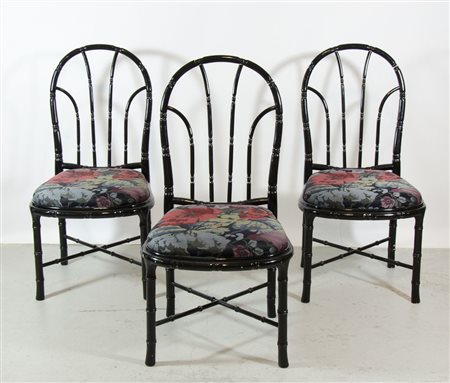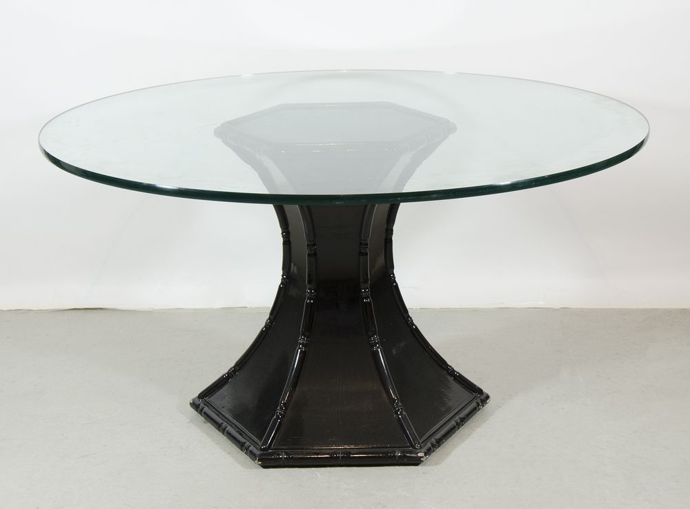 Giorgetti Mobili Lotto composto da tavolo con base in legno nero e piano in cristallo rotondo (diam. cm. 130) e 6 sedie. Anni '70.