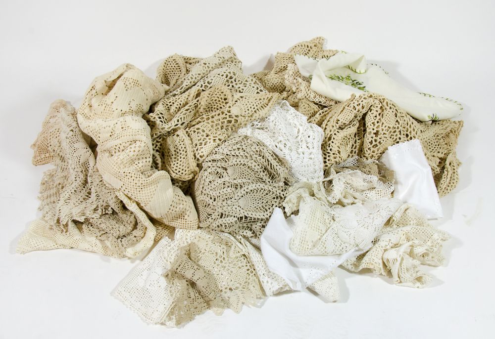 Lotto composto da corpiletto, tovaglia, copritavolo, centrini e strisce ad uncinetto.
