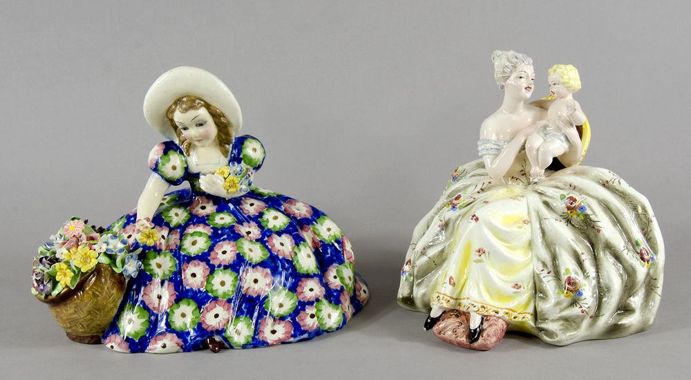 Lotto di 2 sculture in ceramica policroma raffiguranti gentildonna e mamma...