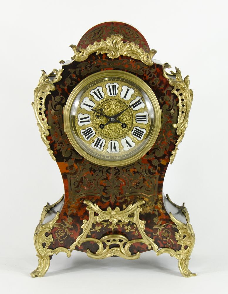 Orologio da tavolo a lavorazione boulle con applicazioni in bronzo dorato,...