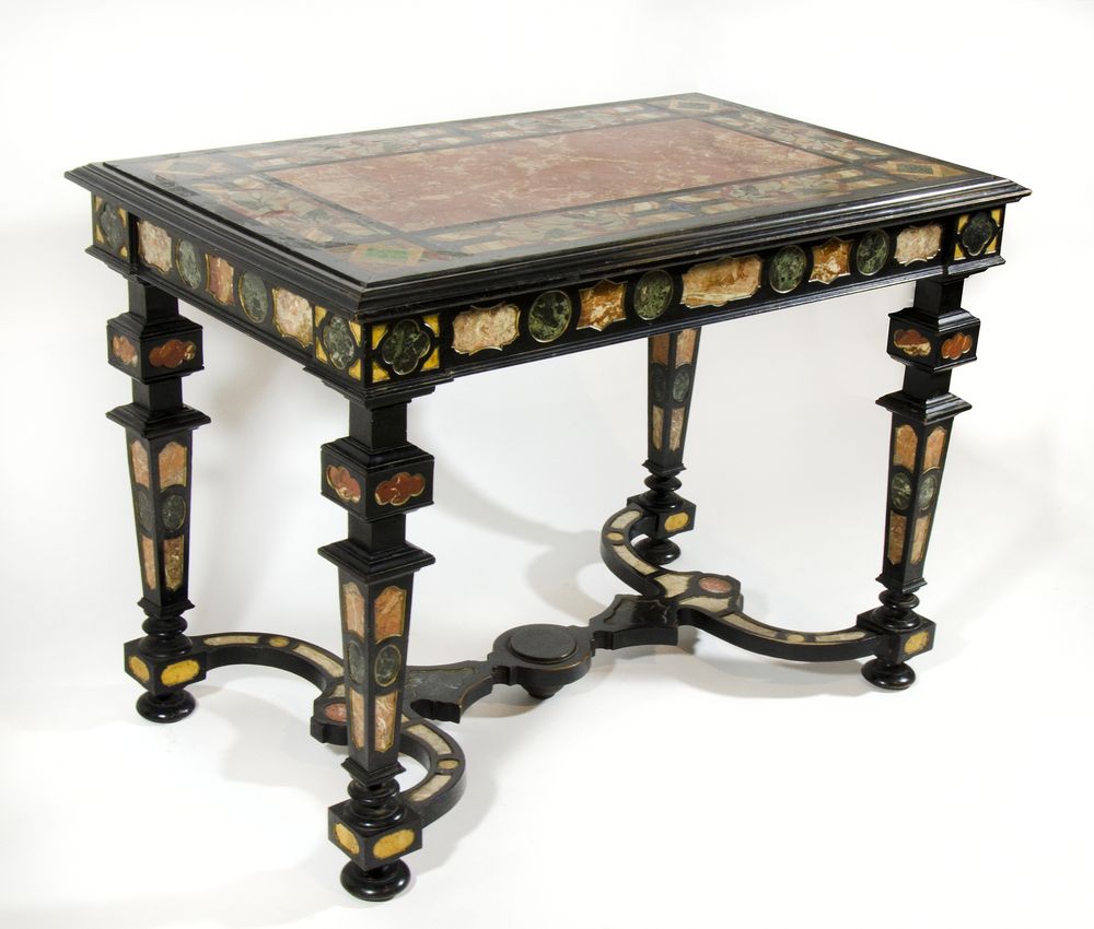 Tavolo in legno ebanizzato riccamente intarsiato in marmi colorati italiani e...