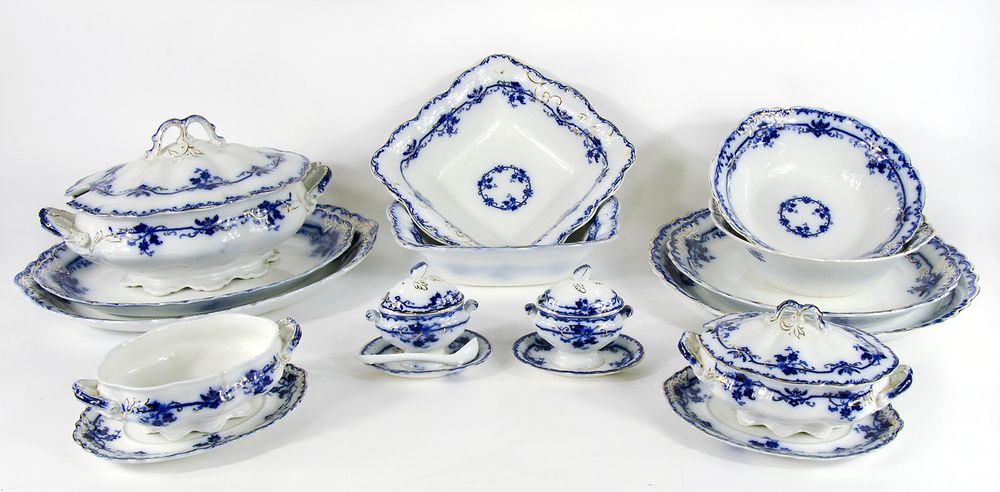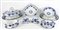 Parte di servizio di piatti in ceramica inglese con decori azzurri.