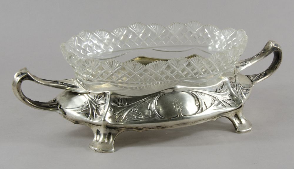 Centrotavola ovale in argento lavorato a sbalzo con manici laterali, interno in cristallo. Austria 1913. Lung. Cm. 45. gr. 420.