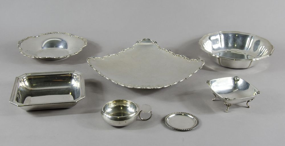 Lotto di vari oggetti in argento tra cui centrotavola e piattini. Gr. 1650.