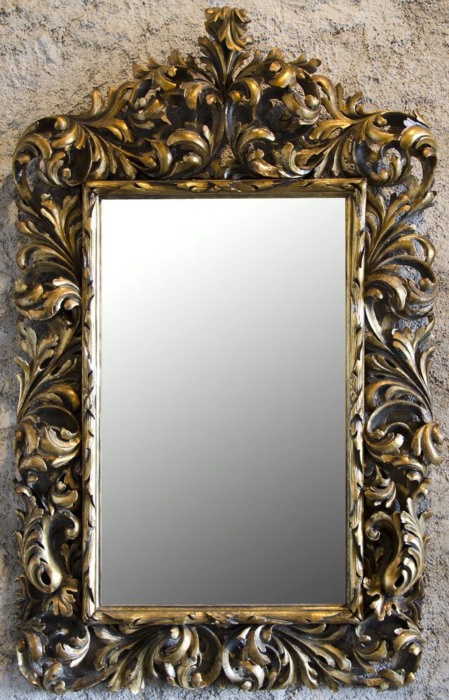 Grande specchiera con cornice in legno dorato riccamente scolpita a volute....