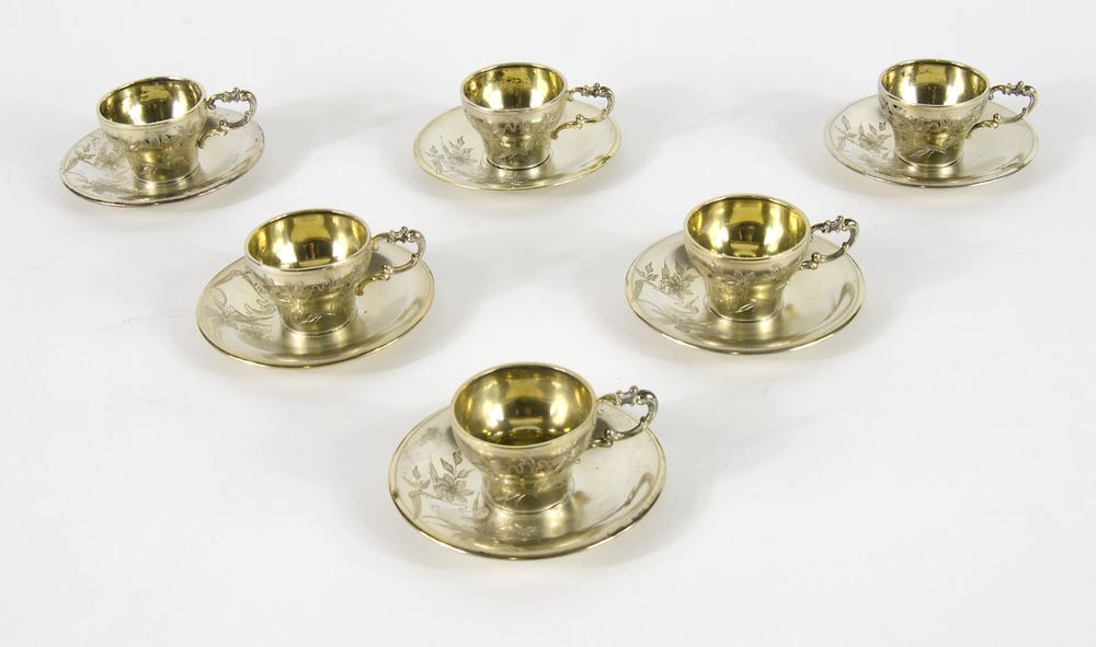 Lotto 695 | Lotto di 6 tazzine in argento con piattini, interno dorato. Gr. 255.