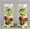 Coppia di vasi in ceramica policroma con frutta in rilievo. H. cm. 38.