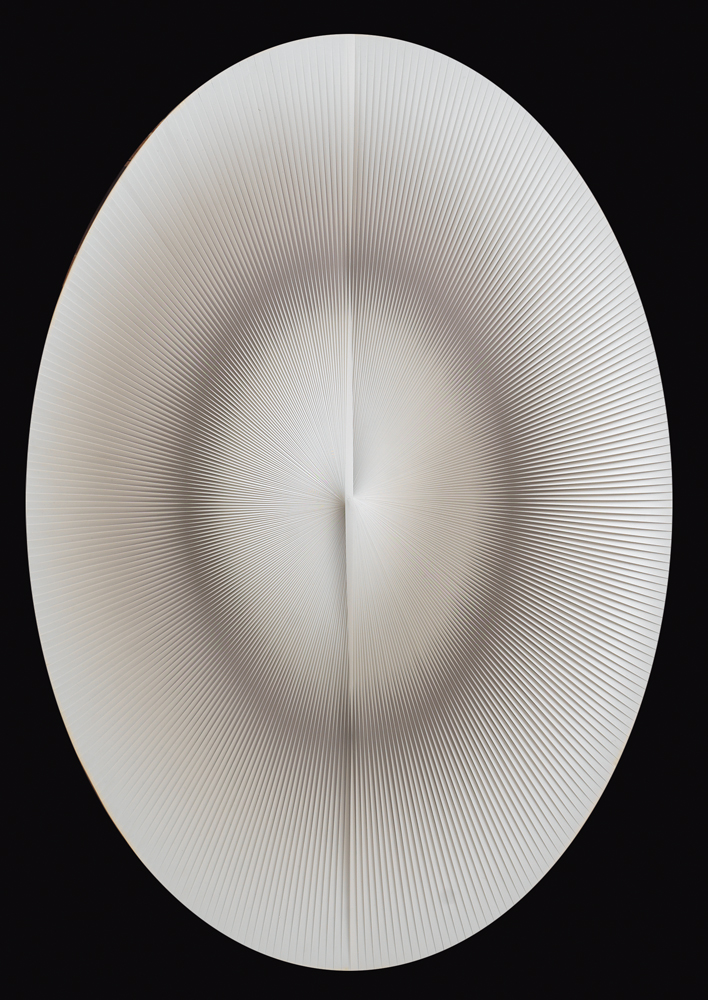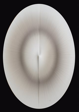 ALBERTO BIASI Padova 02/06/1937 Scudo... e primamente un saldo ci fece smisurato scudo, di dedàleo rilievo, 1966-1978 assemblaggio di lamelle in PVC su legno ovale cm. 85x60 firma, titolo, anno, scritta di pugno dell'artista e timbro della Galleria La Chiocciola al tetro, timbro della Casa del Mantegna, Provincia di Mantova, Assessorato alla Cultura sul bordo destro della teca in vetro, plexiglass, legno e metallo, pubblicato sul catalogo della mostra "Alberto Biasi e Julio Le Parc, L'arte dell'instabilità", a cura di Giovanni Granzotto, tenutasi dal 7 al 11 settembre 2005 presso la Casa del Mantegna (MN), pagina 40.