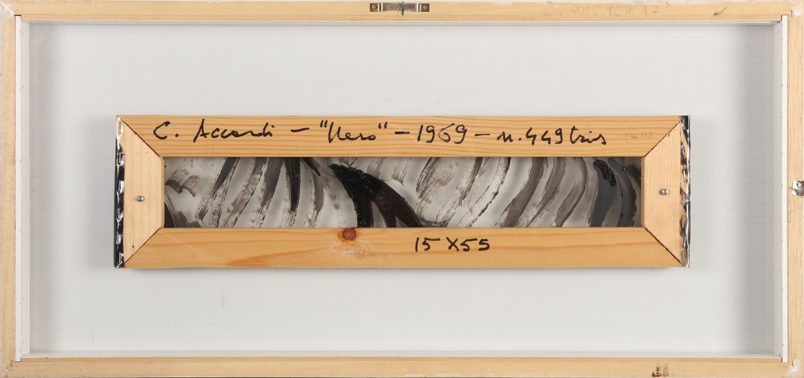 ACCARDI CARLA (1924 - 2014) Nero. 1969. Vernice su sicofoil. Cm 15,00 x 55,00. Al retro titolo, firma e anno. Opera archiviata presso lo Studio Accardi, Roma come da documentazione fotografica allegata all'opera riportante il relativo numero d'inventario e la firma dell'artista. Cornice presente