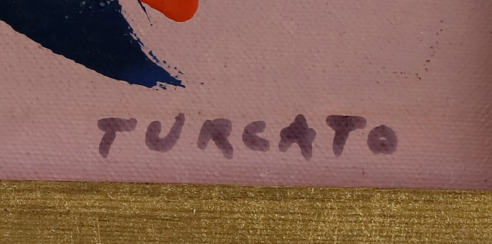 TURCATO GIULIO (1912 - 1995) Senza titolo. Tecnica mista su tela. Cm 60,00 x 50,00. Firma in basso a destra. Al retro timbro Aldo Raccolta, Venezia. Lieve difetto. Opera archiviata presso l'archivio Giulio Turcato, Roma, come da documentazione fotografica allegata all'opera e riportante il relativo numero d'inventario. . Cornice presente