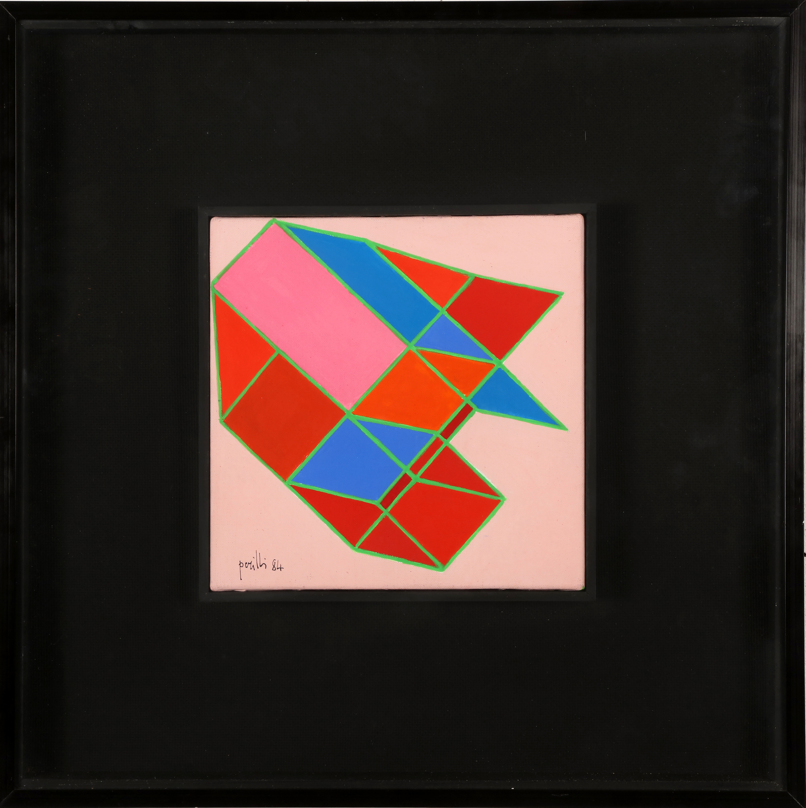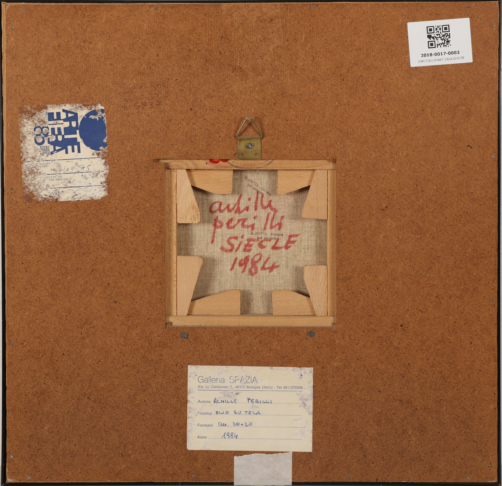 PERILLI ACHILLE (n. 1927) Siecle. 1984. Tecnica mista su tela. Cm 20,00 x 20,00. Firma e anno in basso a sinistra. Al retro titolo, firma, anno, timbro Galleria Botta, Genova; cartiglio descrittivo Galleria Spazia, Bologna e cartiglio Arte Fiera 1985. Cornice presente