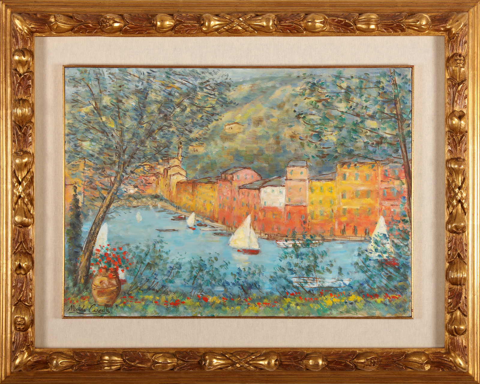 CASCELLA MICHELE (1892 - 1989) Portofino. Oil on canvas . Cm 70,00 x 50,00. Signature lower left. At the back signature and Marescalchi Gallery label. Artist's authenticty certificate on photo. V.I.O.L.A, Novara authenticty certificate. Cornice presente
