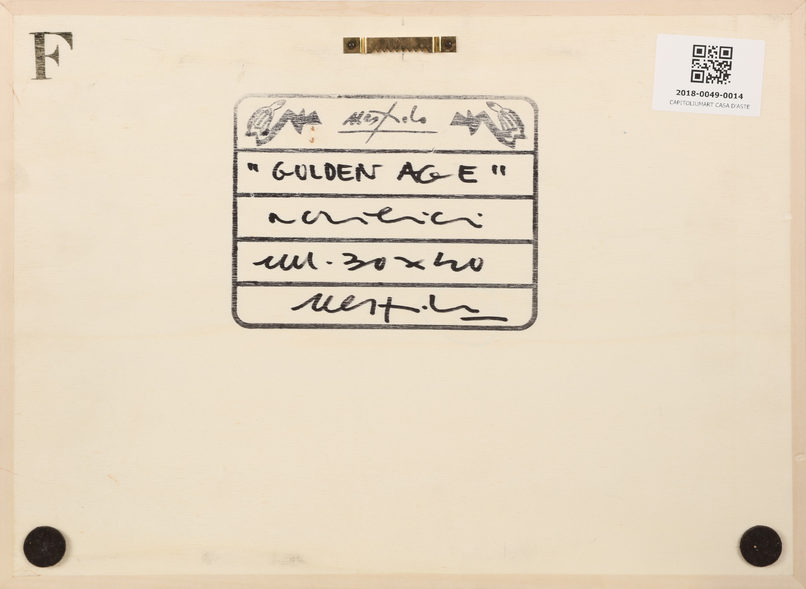 NESPOLO UGO (n. 1941) Golden age. Acrylic on board. Cm 40,00 x 30,00. Signature upper left. At the back title and signature. Artist's authenticty certificate on photo. Within plexiglass case. Cornice presente