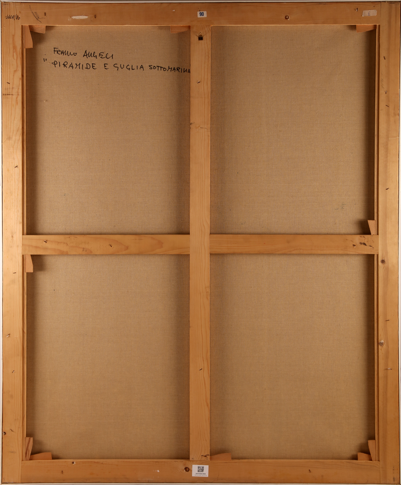 ANGELI FRANCO (1935 - 1988) Piramide e guglia sottomarina. Tecnica mista su tela. Cm 130,00 x 160,00. 1987-88. Al retro titolo e firma. Opera archiviata presso l'Archivio Franco Angeli, Roma come da documentazione fotografica allegata all'opera riportante il relativo numero d'inventario.