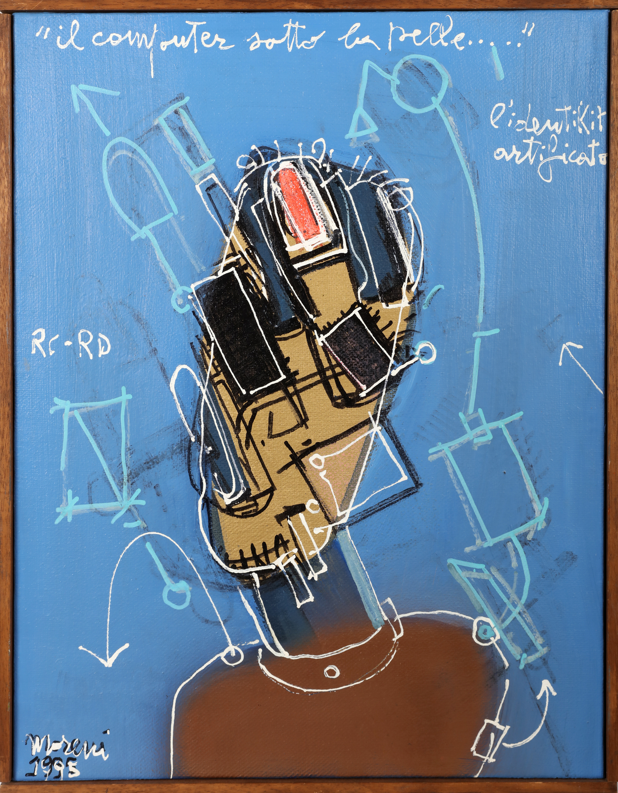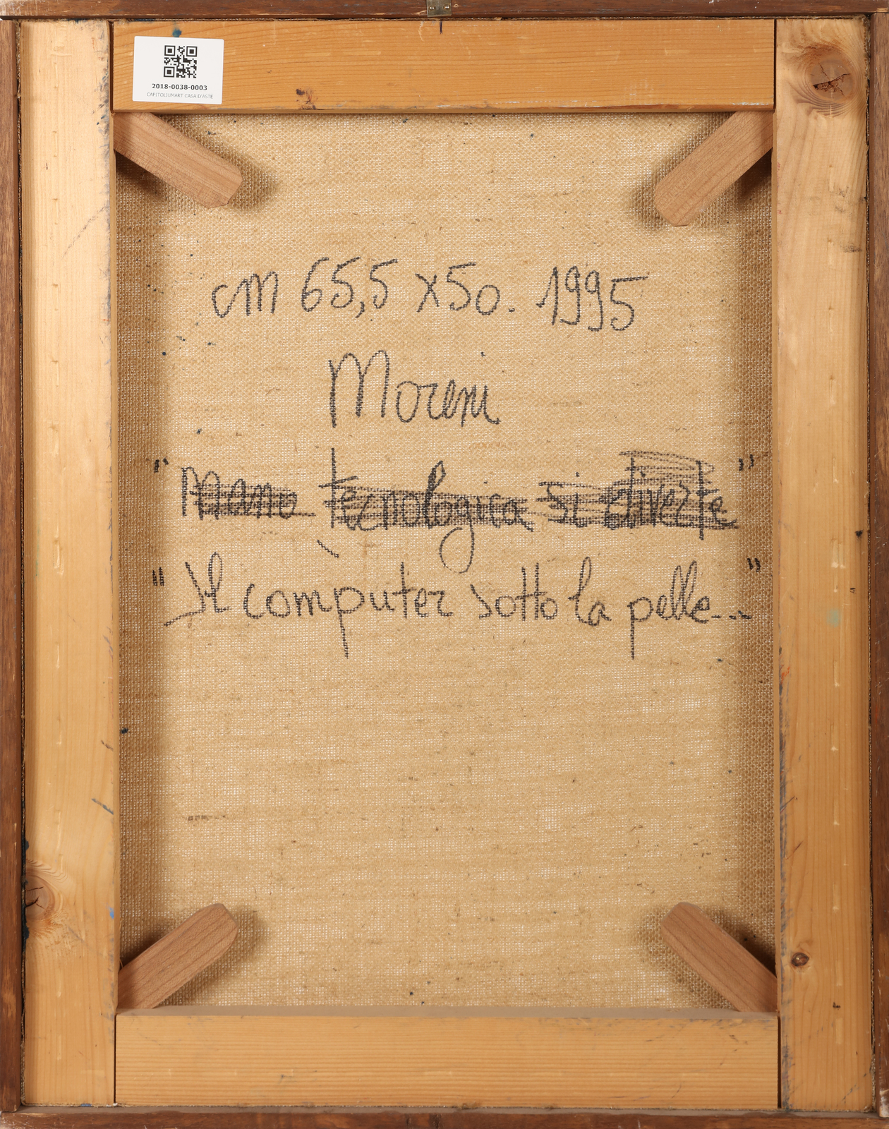 MORENI MATTIA (1920 - 1999) Il computer sotto la pelle... 1995. Olio su tela . Cm 55,00 x 65,50. Titolo in alto al centro, firma e anno in basso a sinistra. Al retro titolo, firma e anno. Cornice presente
