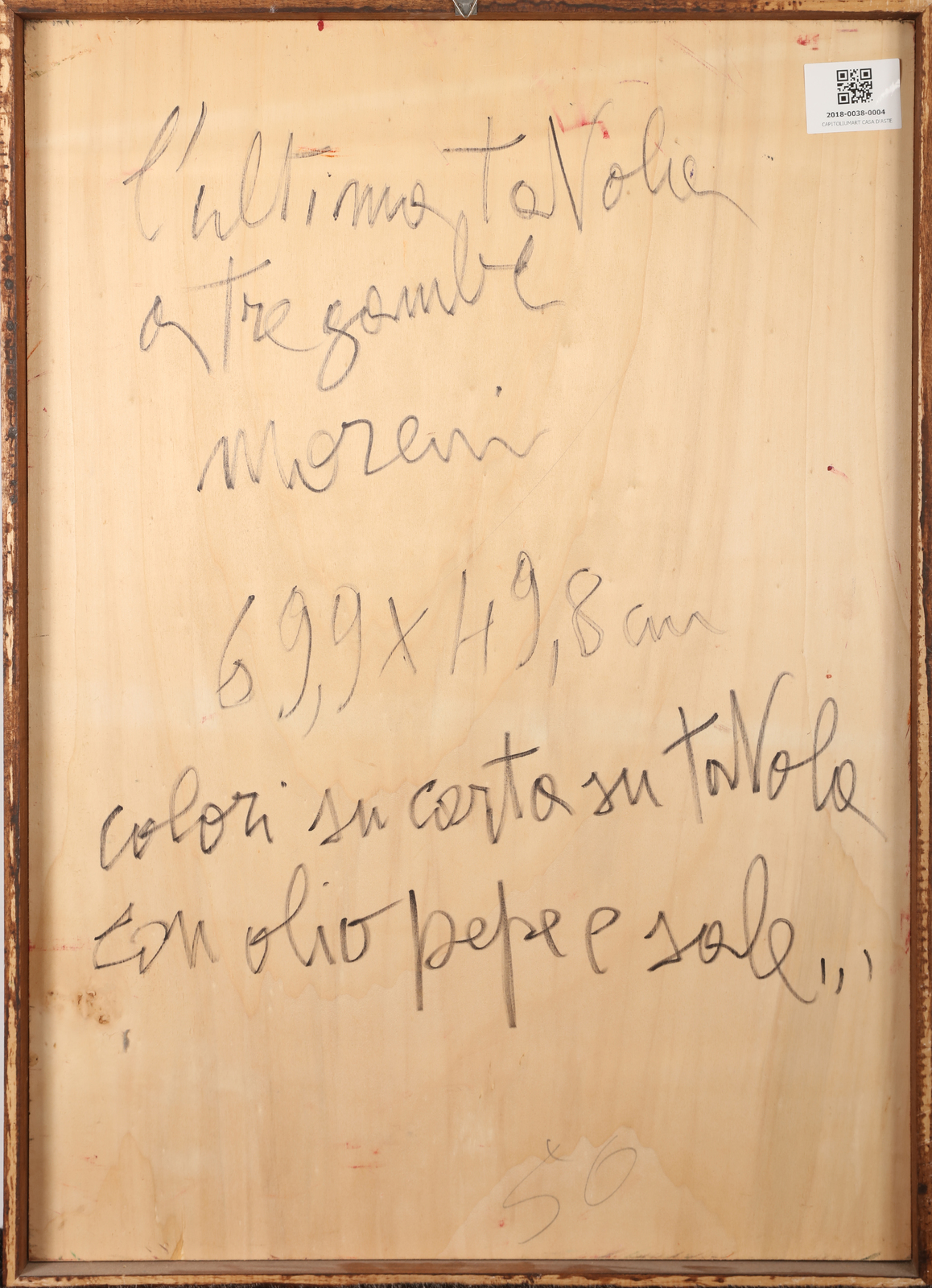 MORENI MATTIA (1920 - 1999) Untitled. 1992. Oil on board. Cm 50,00 x 70,00. Title upper left, signature and year lower centre. At the back title, signature and year. Cornice presente