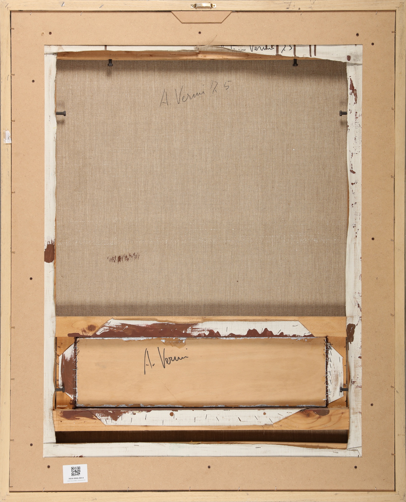 VERMI ARTURO (1928 - 1988) Figure nello spazio tempo. 1975. Tecnica mista su tela. Cm 80,00 x 100,00. Firma e anno al retro. Opera archiviata presso l'Archivio Arturo Vermi, Paderno d'Adda come da documentazione fotografica allegata all'opera riportante il relativo numero d'inventario. Cornice presente