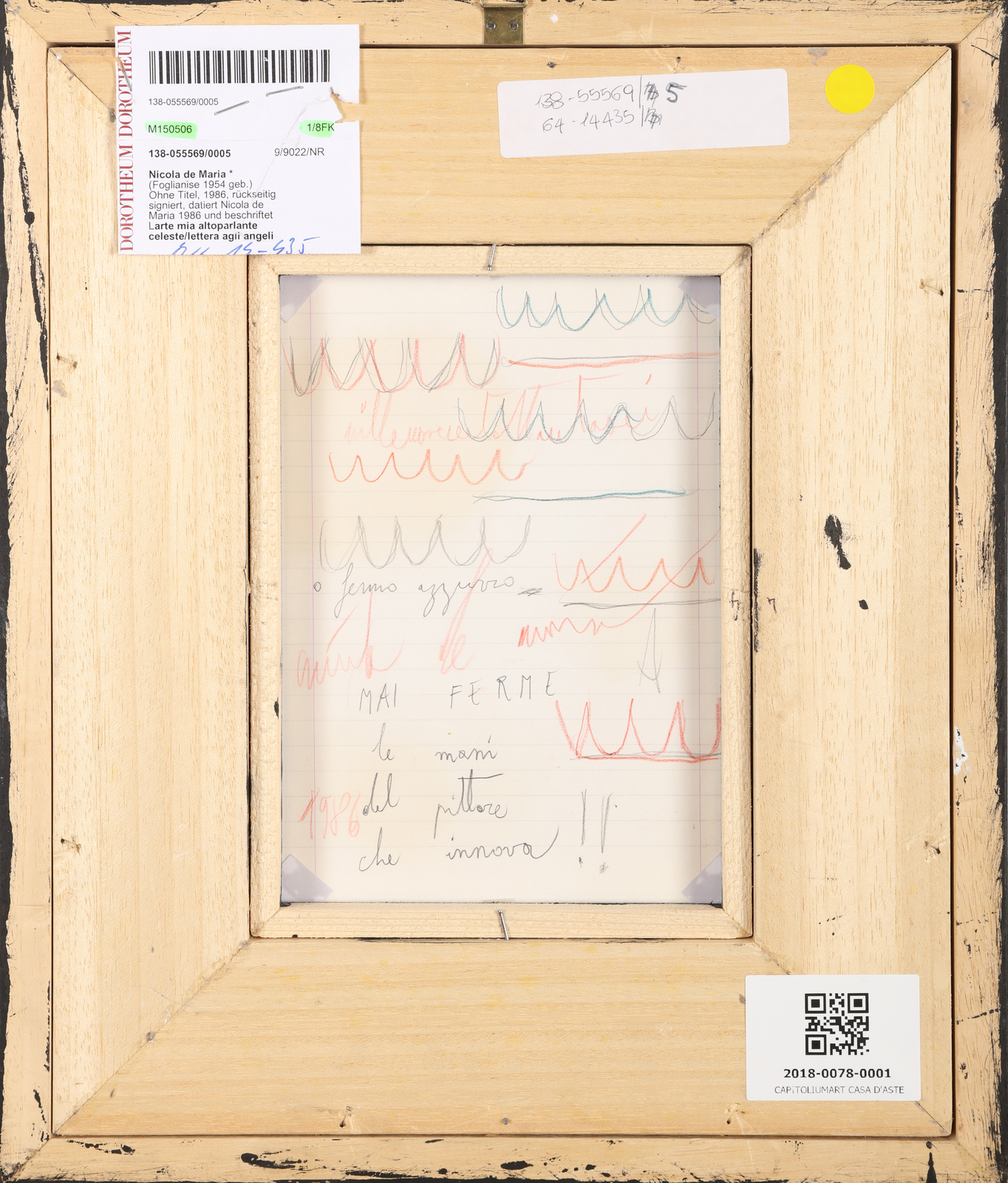 DE MARIA NICOLA (n. 1954) Never stop the artist's hands... 1986. Mixed media on paper. Cm 15,00 x 21,00. Title lower right. At the back title, signature and year.. Cornice presente