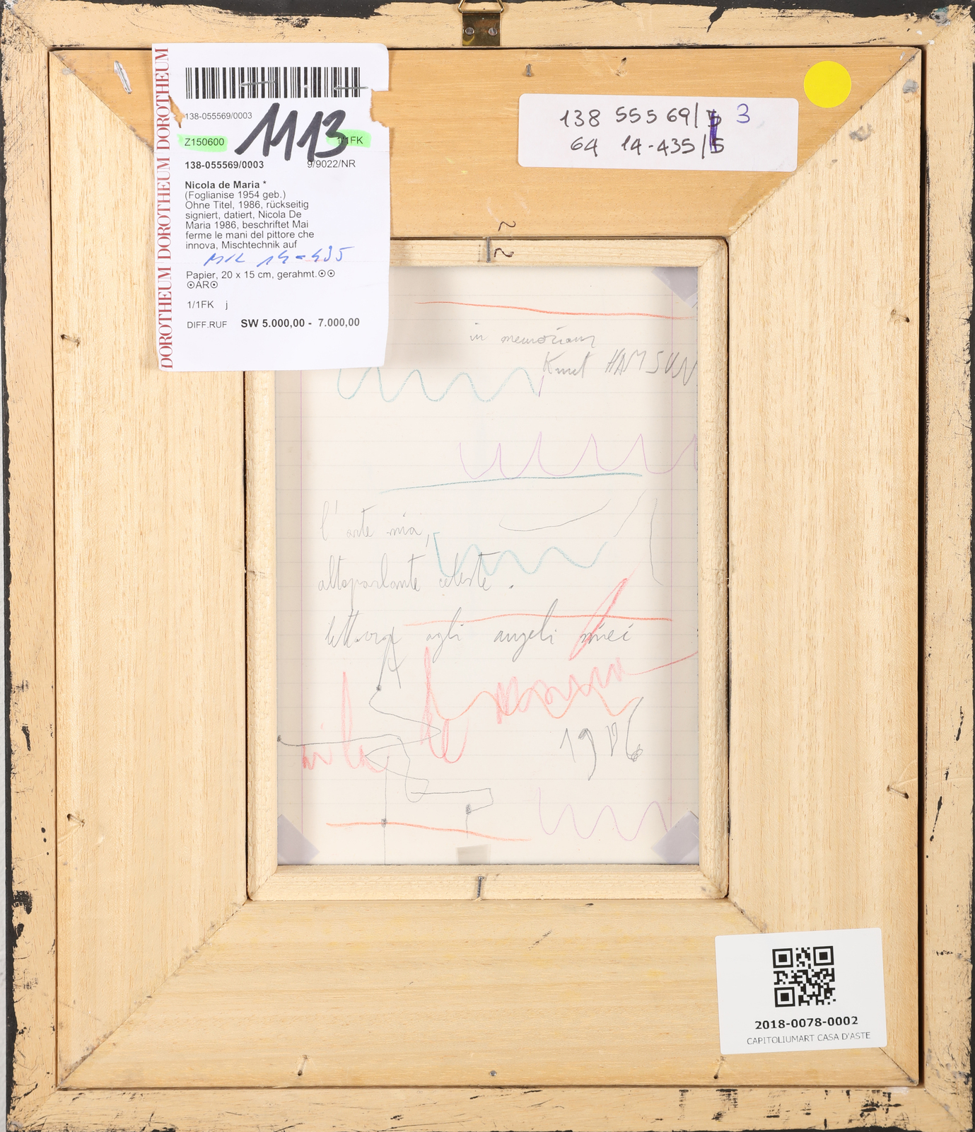 DE MARIA NICOLA (n. 1954) L'arte mia, altoparlante celeste. Lettura negli angeli miei. 1996. Tecnica mista su carta. Cm 15,00 x 21,00. Al retro titolo, firma e anno. Cornice presente