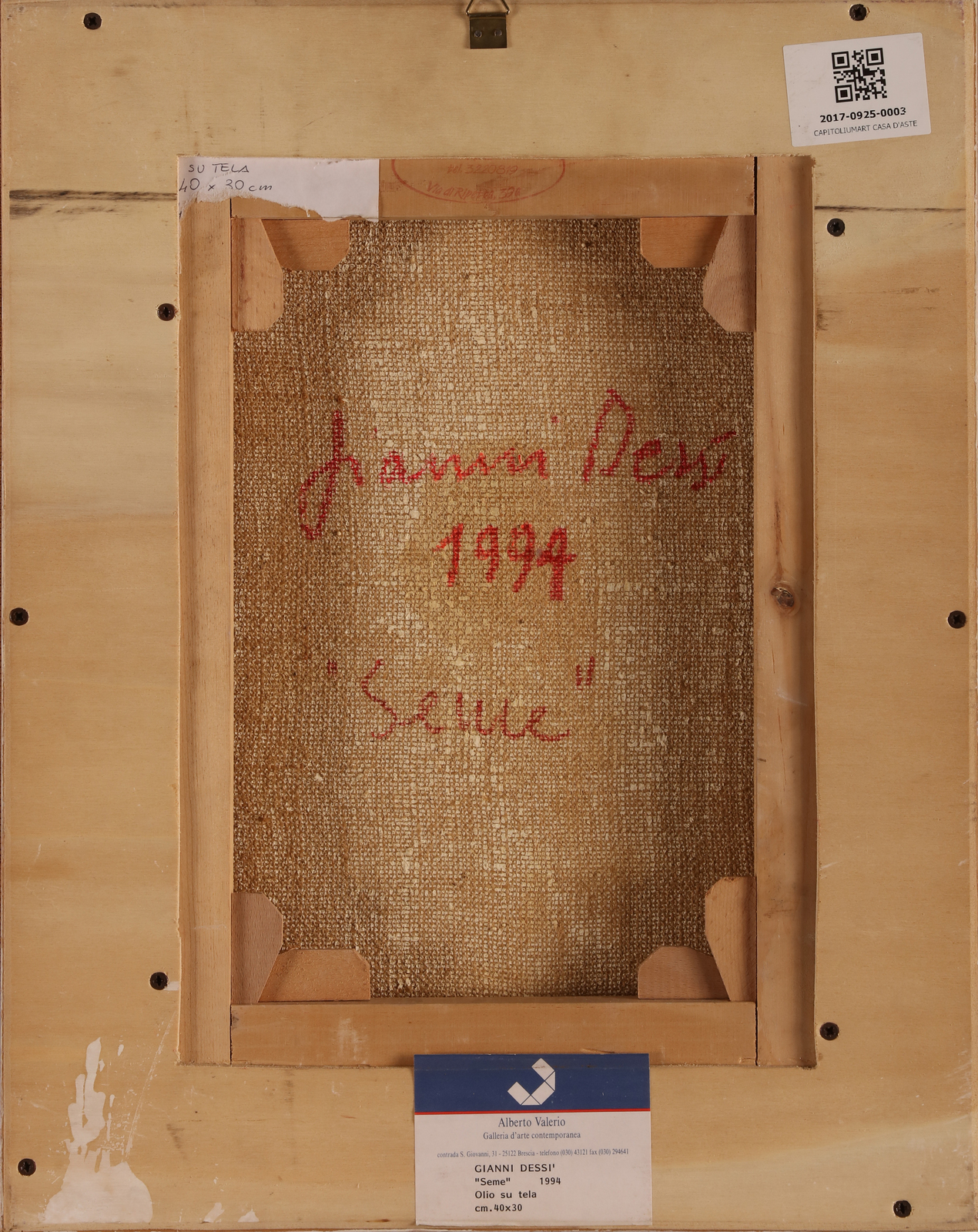 DESSI' GIANNI (n. 1955) Seme. 1994. Tecnica mista su tela. Cm 30,00 x 40,00. Al retro titolo, firma, anno e cartiglio descrittivo Galleria d'arte Alberto Valerio, Brescia. Certificato di autenticità Galleria d'Arte Contemporanea Alberto Valerio, Brescia. Cornice presente