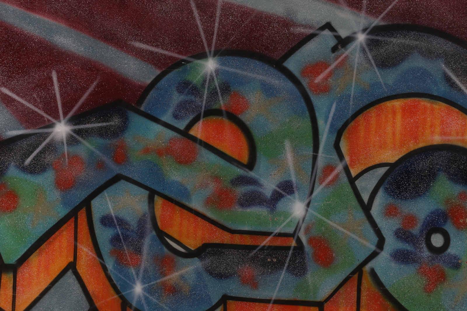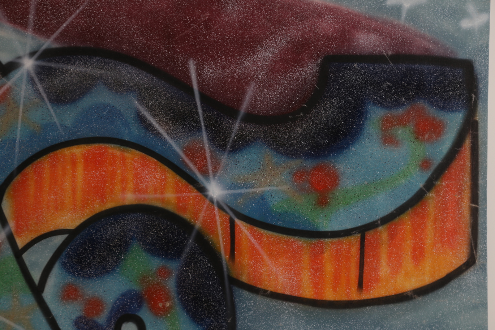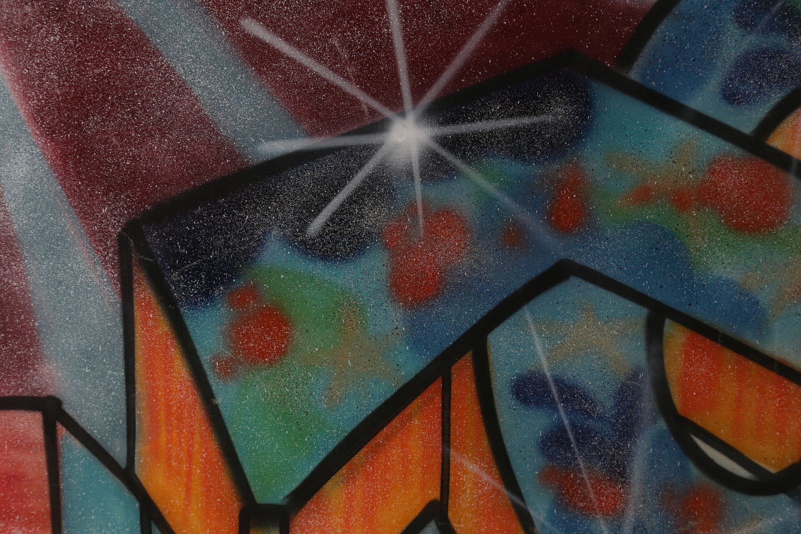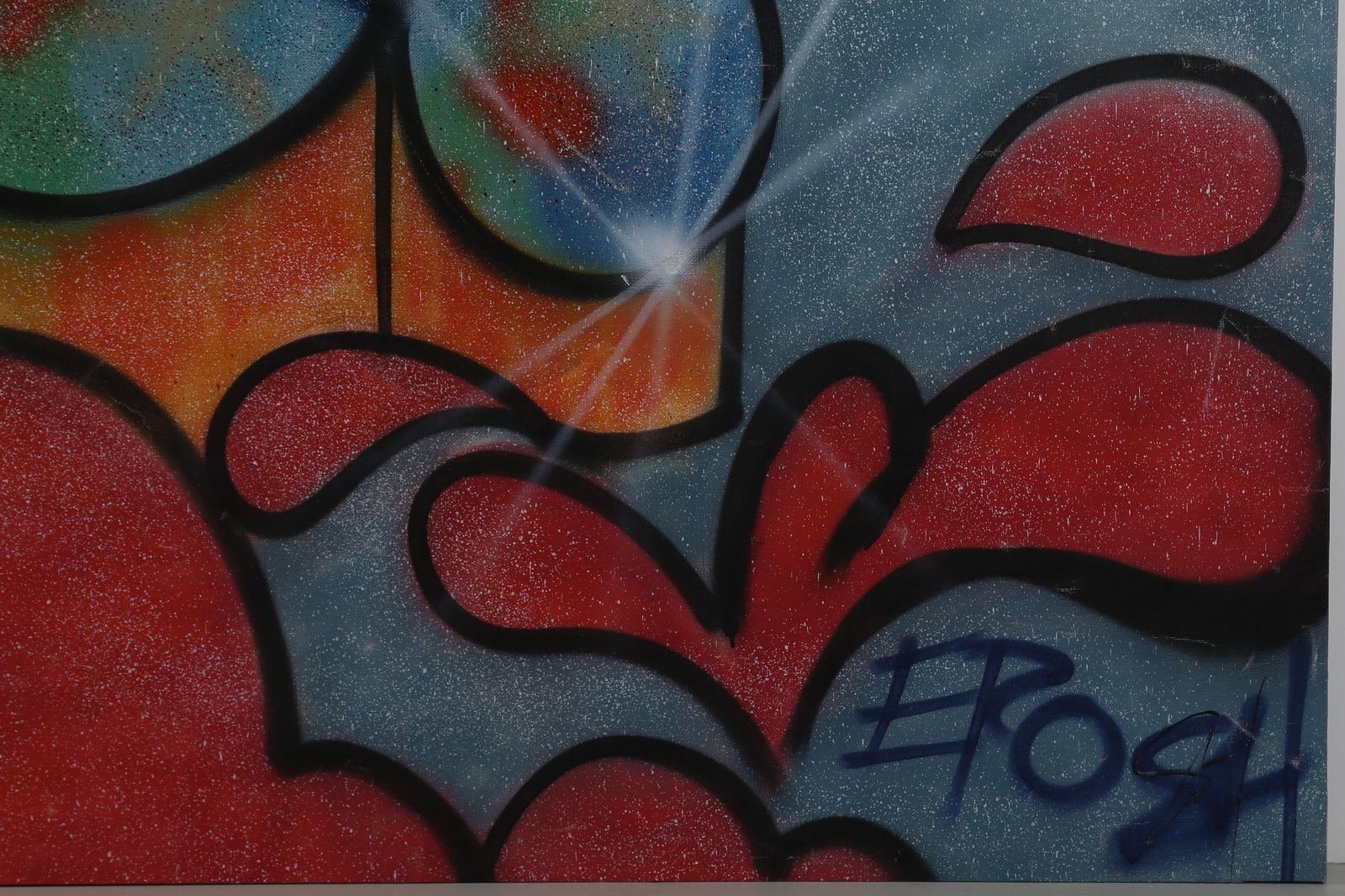 ERO (n. 1967) Senza titolo. Spray su tela. Cm 310,00 x 200,00. Firma in basso a destra. Pubblicazioni: Arte di Frontiera, Quattordio graffiti, a cura di Tommaso Trini, Mazzotta editore. Provenienza: Associazione culturale Stradedarts, Milano.