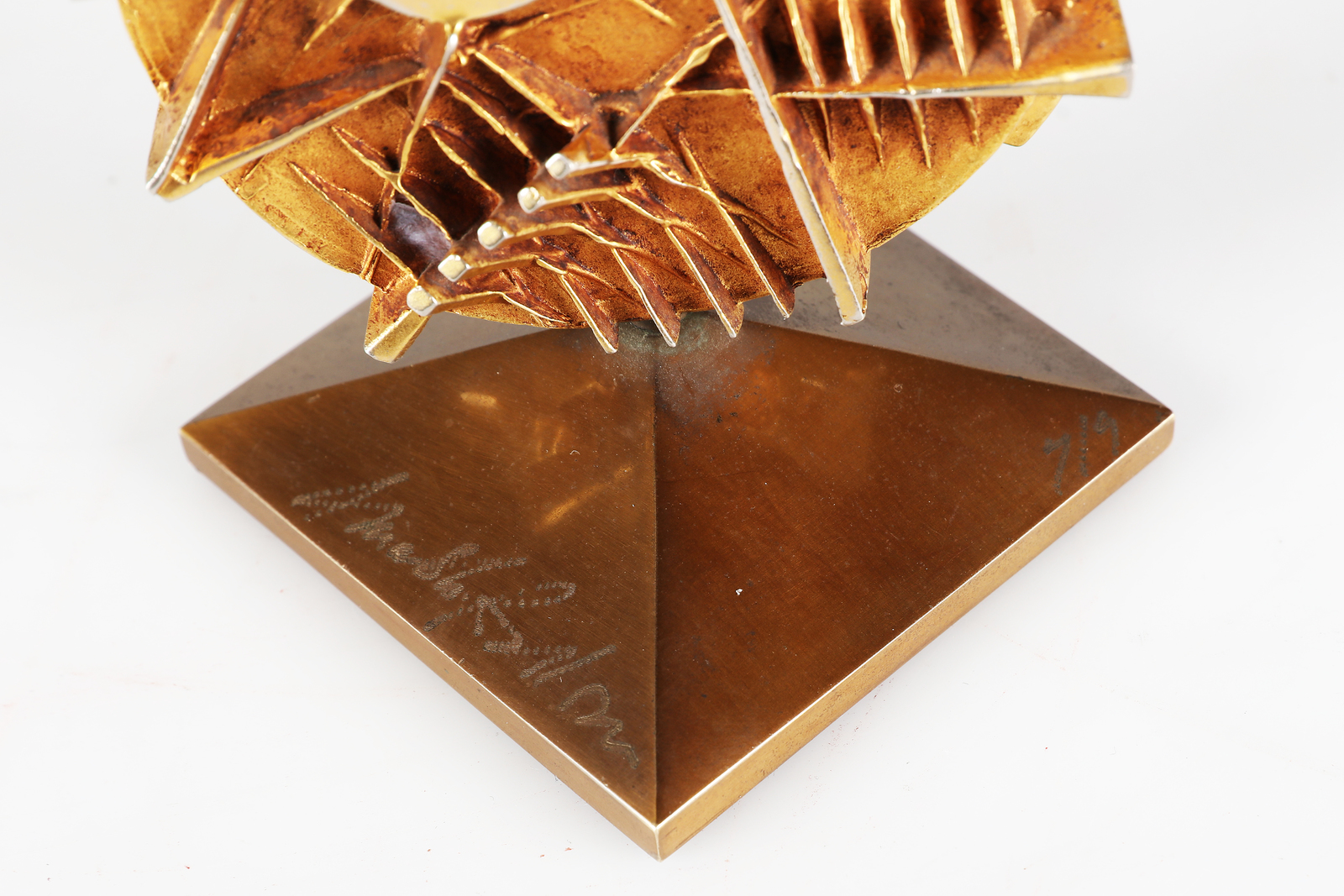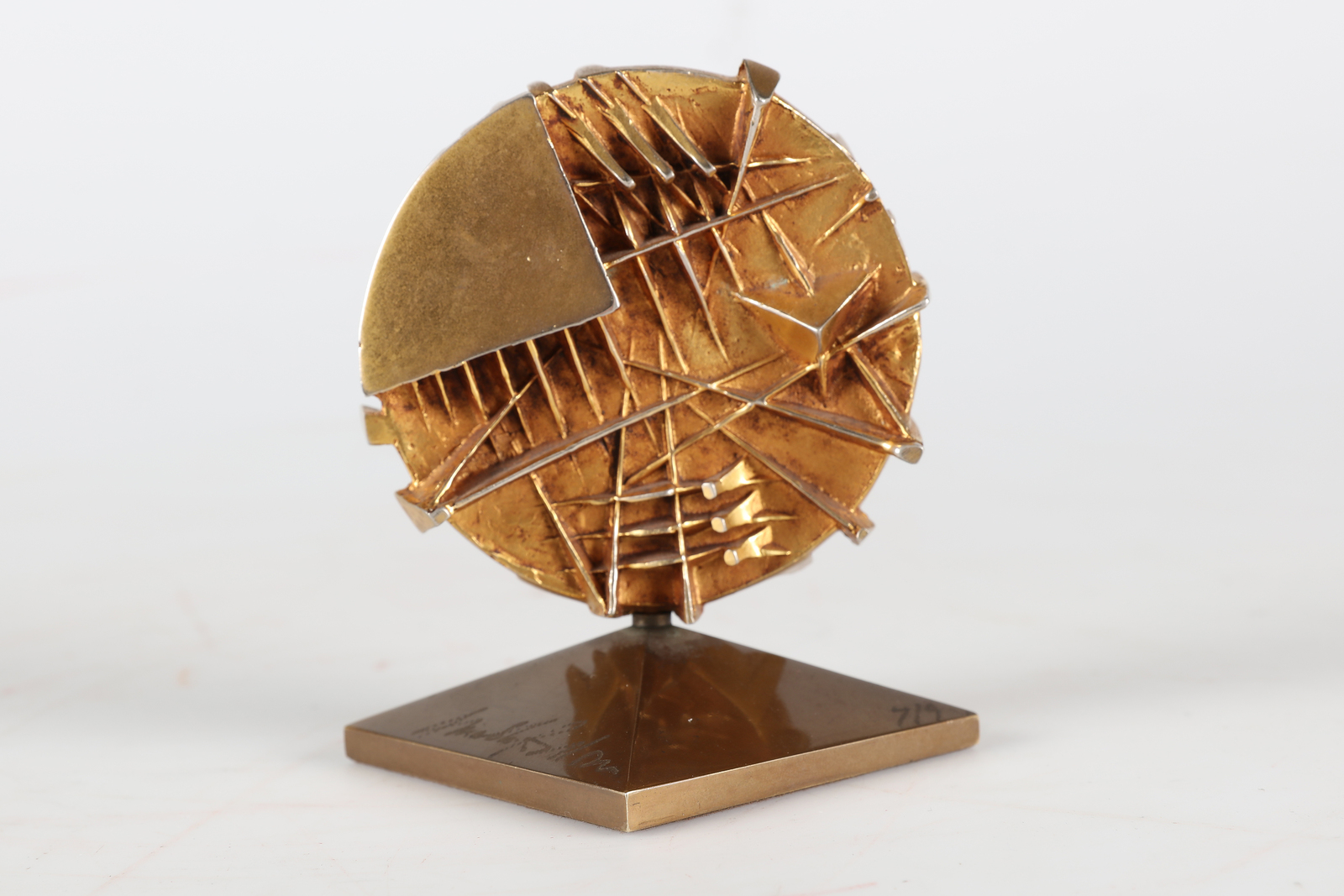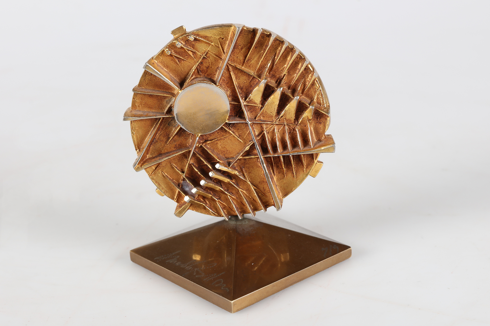 POMODORO ARNALDO (n. 1926) Disco. Bronzo dorato. Cm 8,00 x 8,00. Tiratura e firma alla base. 1983-84. Edizione: 9 + 5 P.A. tutti fusi a cera persa e provvisti di base triangolare. Esemplare: 7. Opera catalogata nell'archivio dei multipli della Fondazione Arnaldo Pomodoro come da comunicazione scritta riportante il relativo numero di archivio. Con lo stesso soggetto sono stati prodotti altri 500 esemplari alcuni con la base e altri senza, realizzati con il metodo a conio dallo stabilimento Stefano Johnson di Milano.