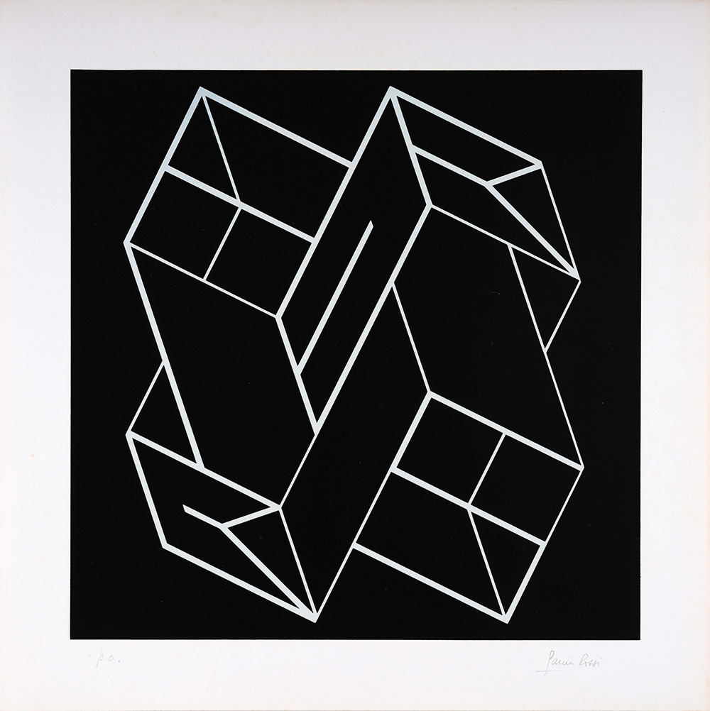HORACIO GARCIA ROSSI 1929 - 2012 “Garcia Rossi ritratto nei nomi di Albers, Herbin, Malevitch, Max Bill, Mondrian”, 1974-78 Cartella contenente 5 serigrafie e un testo a cura di Germano Beringheli, cm. 50 x 50 Esseri Edizioni Genova Cartella in edizione di 90 esemplari + 10 prove d’artista Prova d’artista Firmato in basso a destra Prov. Collezione Privata