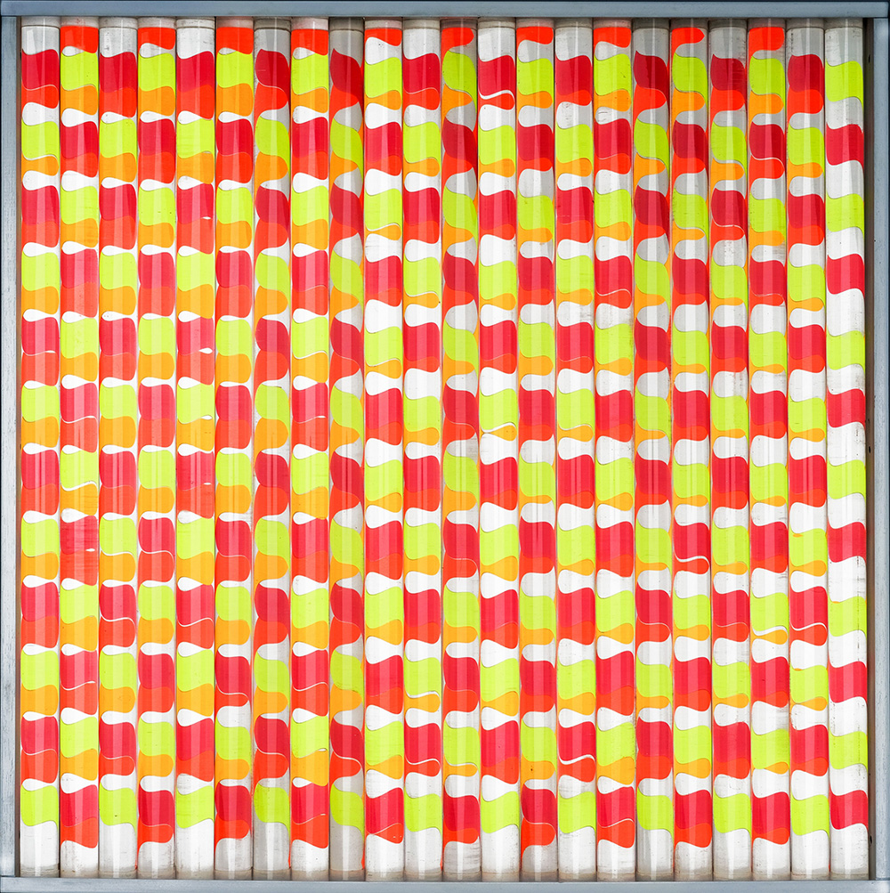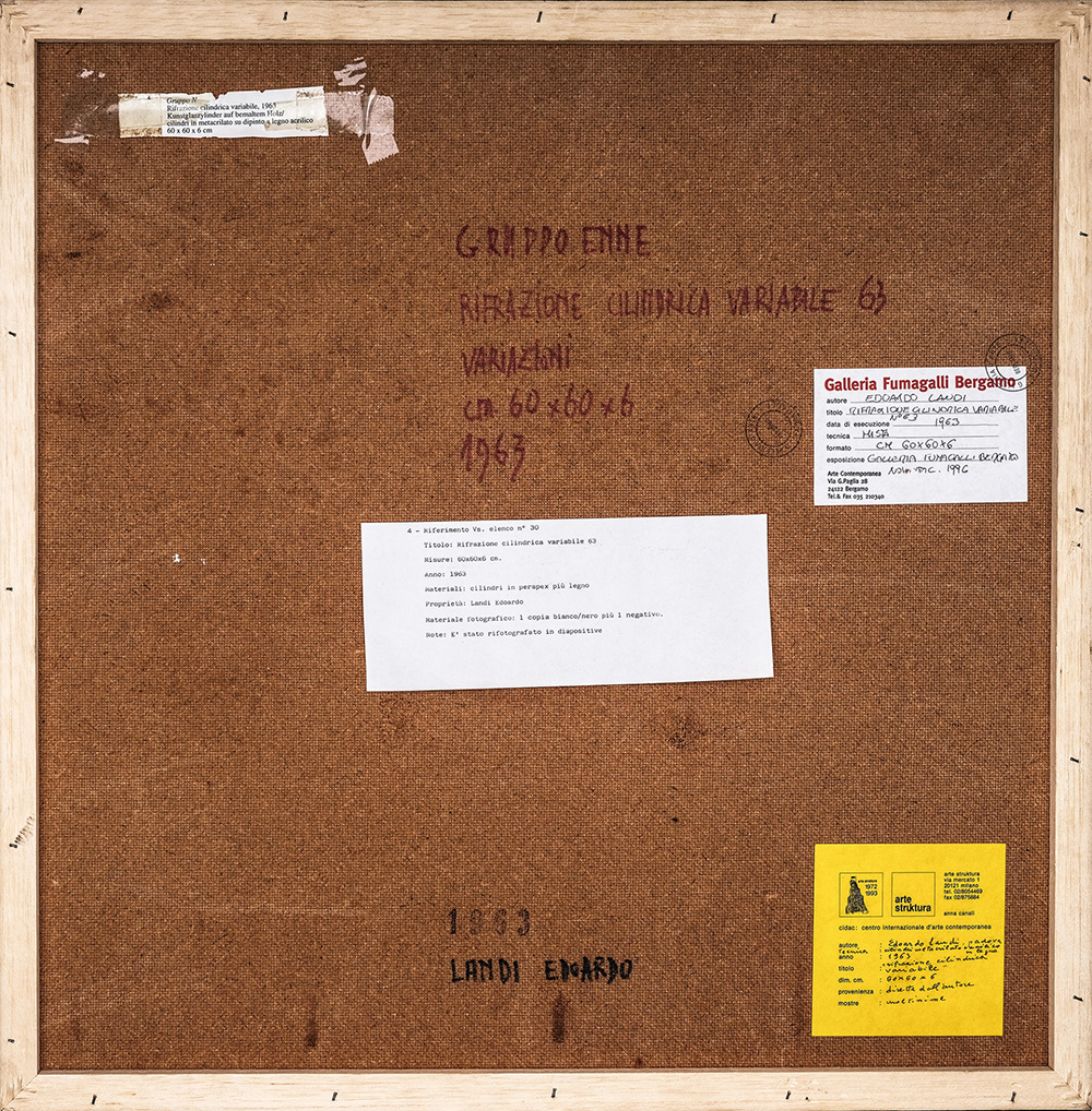 EDOARDO LANDI 1937 Rifrazione cilindrica variabile, 1963 Cilindri in perspex e legno, cm. 60 x 60 x 6 Firmato e datato sul retro Etichetta e timbro Galleria Fumagalli, Bergamo sul retro Etichetta Arte Struktura, Milano sul retro Prov. Collezione dell’Artista Prov. Collezione Privata