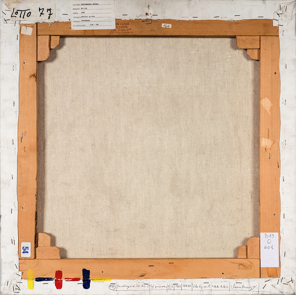 ANTONIO SCACCABAROZZI 1936 - 2008 Prevalenze 1-6-V.O. div.2 Tre primari 1| |6, 1976 Acrilico su tela, cm. 60 x 60 Firmato e datato sul retro Timbro Galleria Il Sole, Bolzano sul retro La tela presenta una leggera craquelé sulla superficie Prov. Collezione Privata