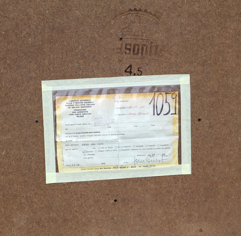 JORRIT TORNQUIST 1938 Opus 509, 1974 Acrilico su tela, cm. 40 x 40 Firmato e datato sul retro Timbro dell’artista sul retro Autentica dell’artista su fotografia ESPOSIZIONI: “V Mostra Biennale omaggio dell’arte italiana al dolore innocente”, Fondazione Pro Juventute “Don Carlo Gnocchi”, Milano, 1974 Prov. Collezione Privata
