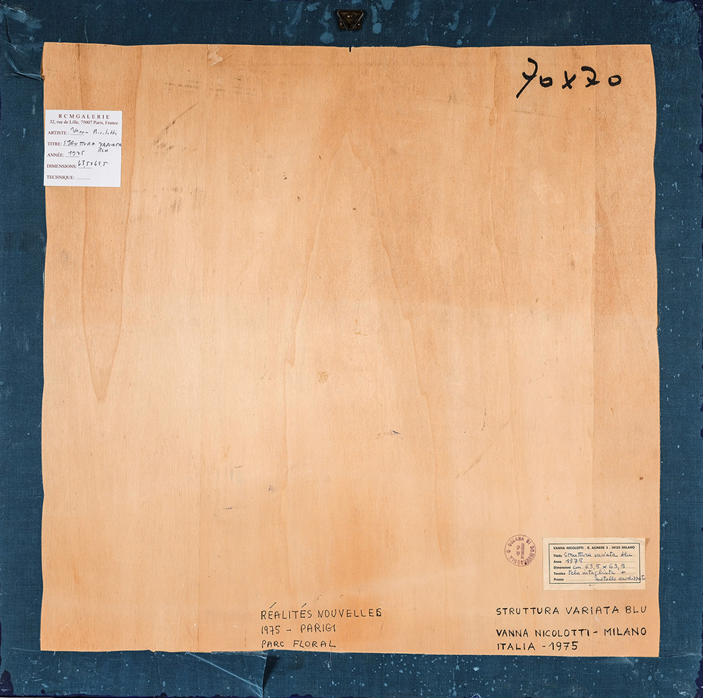 VANNA NICOLOTTI 1929 Struttura variata blu, 1975 Tela intagliata con metallo anodizzato applicati su tavola, cm. 63,5 x 63,5 Firmato e datato Etichetta RCM Galerie, Parigi sul retro Etichetta dell’artista sul retro Prov. Collezione Privata