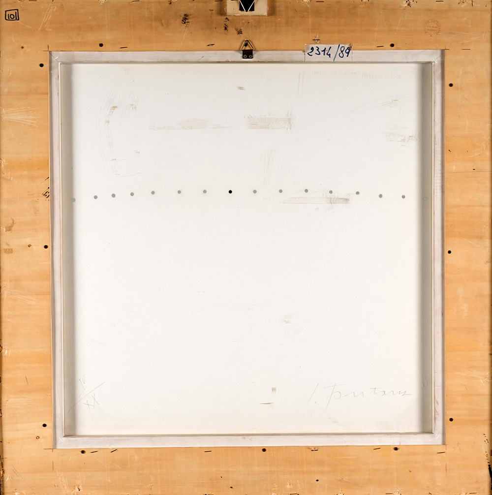 LUCIO FONTANA 1899 - 1968 Concetto Spaziale - Teatrino, 1968 Multiplo, quattro fogli di cartone nero ritagliati e incollati, cm. 70 x 70 Edition Plus, Baden-Baden 75 esemplari (+ 20 in numeri romani) Opera n. IV/XX Firmato sul retro Timbro Galleria Arte Centro, Milano sul retro Opera archiviata presso la Fondazione Lucio Fontana n. 2634/2 PUBBLICAZIONI: “Lucio Fontana - incisioni, grafica, multipli, pubblicazioni…”, Reperito Edizioni, Trento, 2007, p. 157 Prov. Collezione Privata