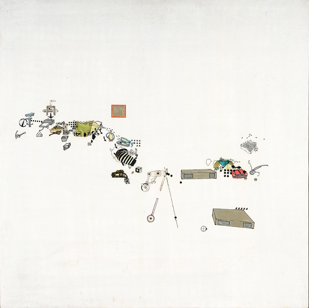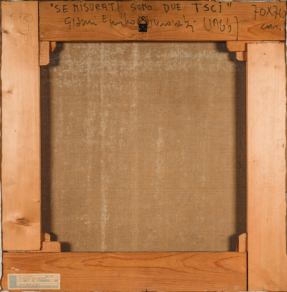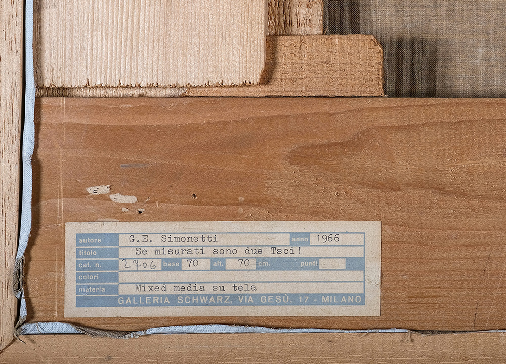 GIANNI EMILIO SIMONETTI 1940 Se misurati sono due tsci, 1966 Tecnica mista su tela, cm. 70 x 70 Firmato e datato sul retro Etichetta Galleria Schwarz, Milano sul retro Prov. Collezione Privata