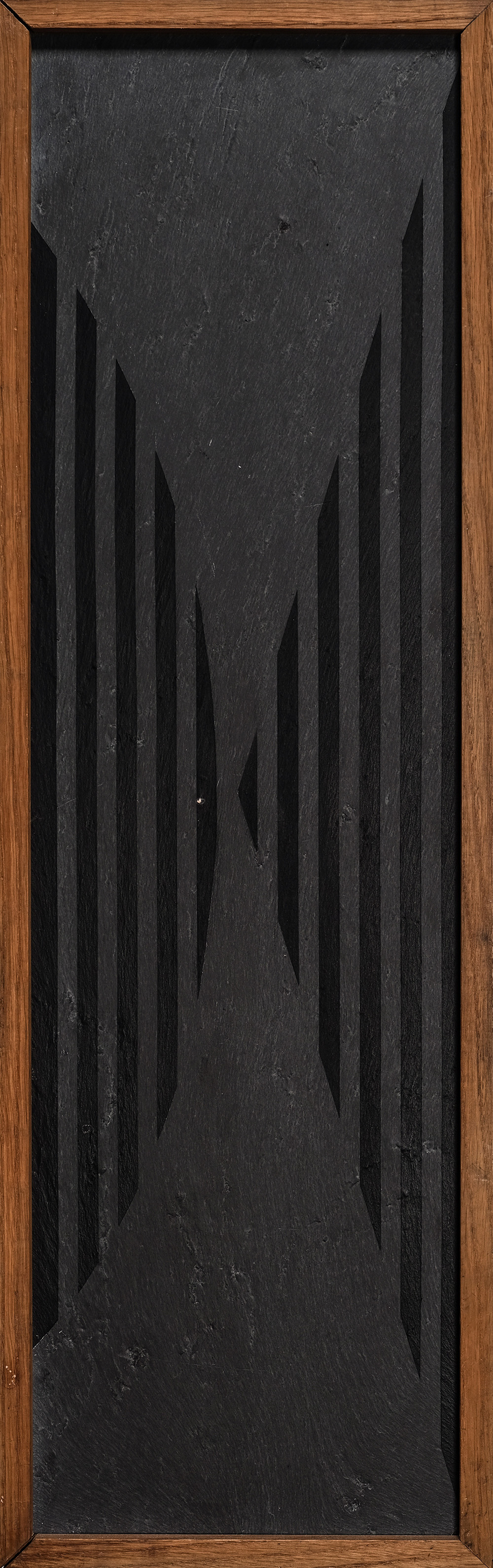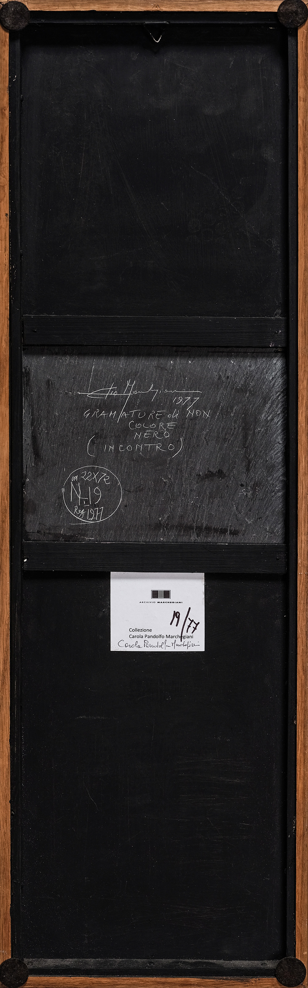 ELIO MARCHEGIANI 1929 Grammature di non colore nero (incontro), 1977 Lavagna, cm. 72 x 22 Firmato e datato sul retro Etichetta Archivio Marchegiani, sul retro Prov. Collezione Carola Pandolfo Marchegiani Prov. Collezione Privata