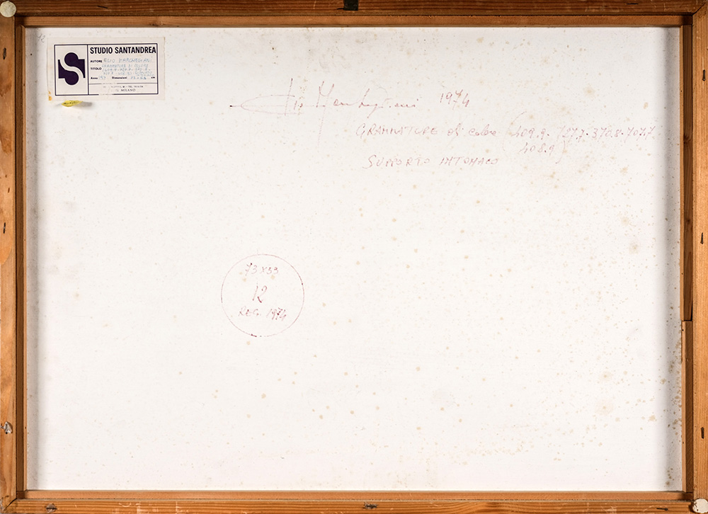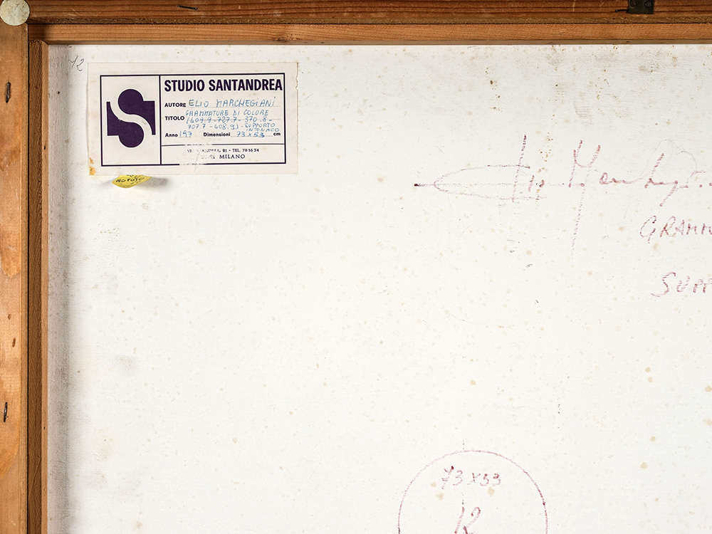 ELIO MARCHEGIANI 1929 Grammatura di colore, 1974 Grammature di colore su intonaco, cm. 50 x 70 Firmato e datato sul retro Etichetta Studio Santandrea, Milano sul retro Prov. Collezione Privata