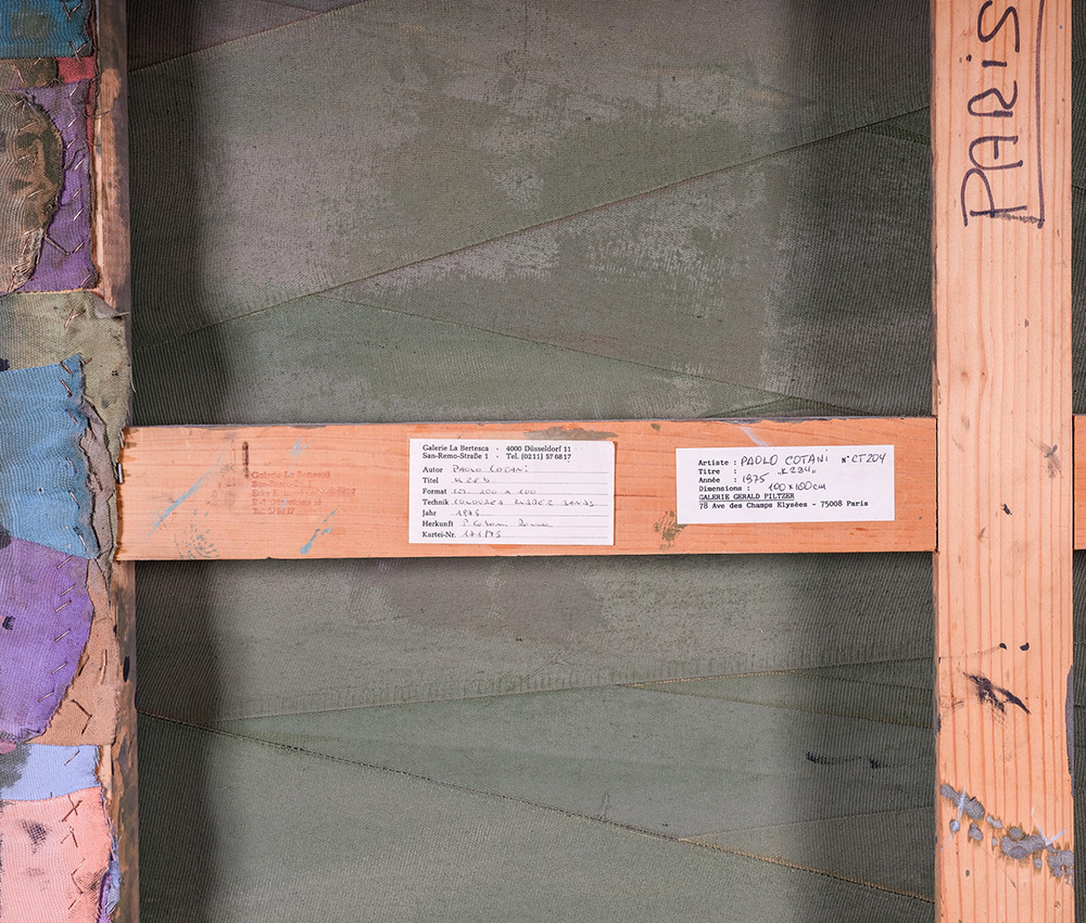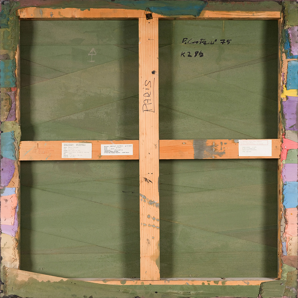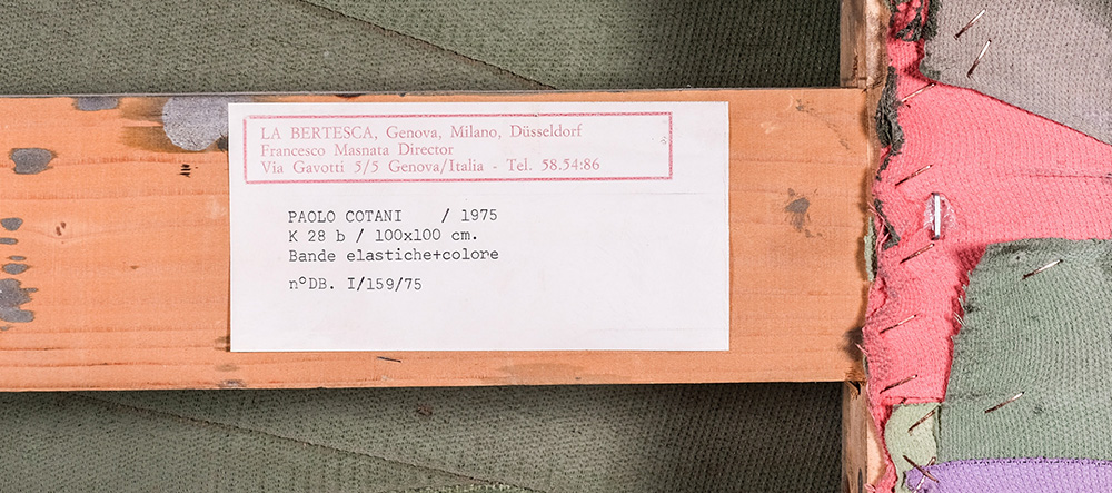 PAOLO COTANI 1940 - 2011 K28b, 1975 Acrilico su bende elastiche, cm. 100 x 100 Firmato e datato sul retro Etichetta Galleria Gerald Piltzer, Parigi sul retro Etichetta Galleria La Bertesca, Genova sul retro Etichetta e timbro Galleria La Bertesca, Dusseldorf sul retro Prov. Collezione Privata