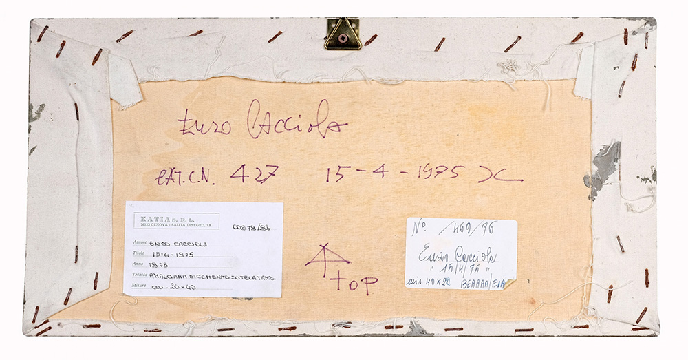 ENZO CACCIOLA 1945 15 - 4 - 75, 1975 Cemento su tela tamburata, cm. 20 x 40 Firmato e datato sul retro Etichetta Katia s.r.l., Genova sul retro Autentica dell’artista su fotografia Prov. Collezione Privata