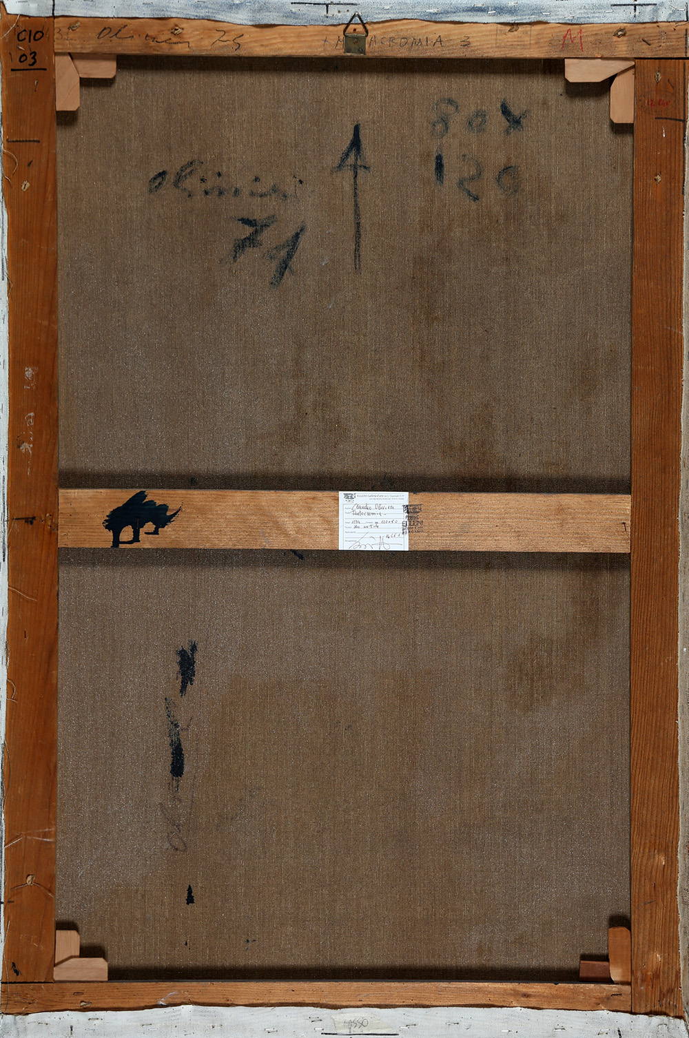 CLAUDIO OLIVIERI 1934 Senza titolo, 1974 Olio su tela, cm. 120 x 80 Firmato e datato sul retro Etichetta e timbro Galleria Elleni, Bergamo sul retro Prov. Collezione Privata