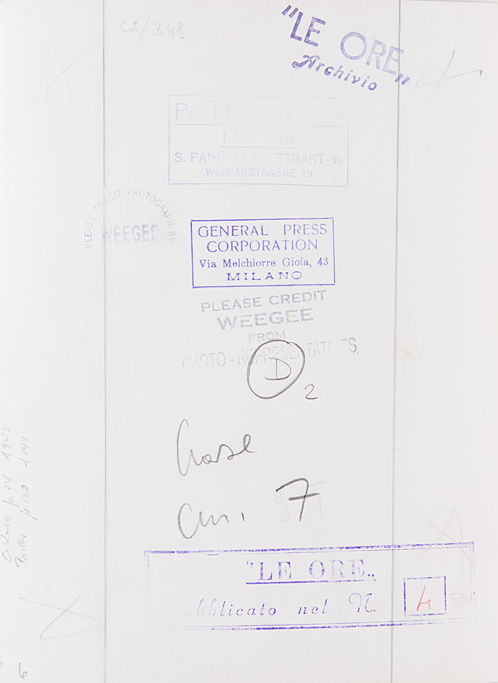 "Weegee's New York; Photographs, 1935-1960", Ed. Schirmer Art Books, London & Munich, 2000, pag. 34;" Wegee's world", Bulfinch Press, New York, 1997, pag.120.