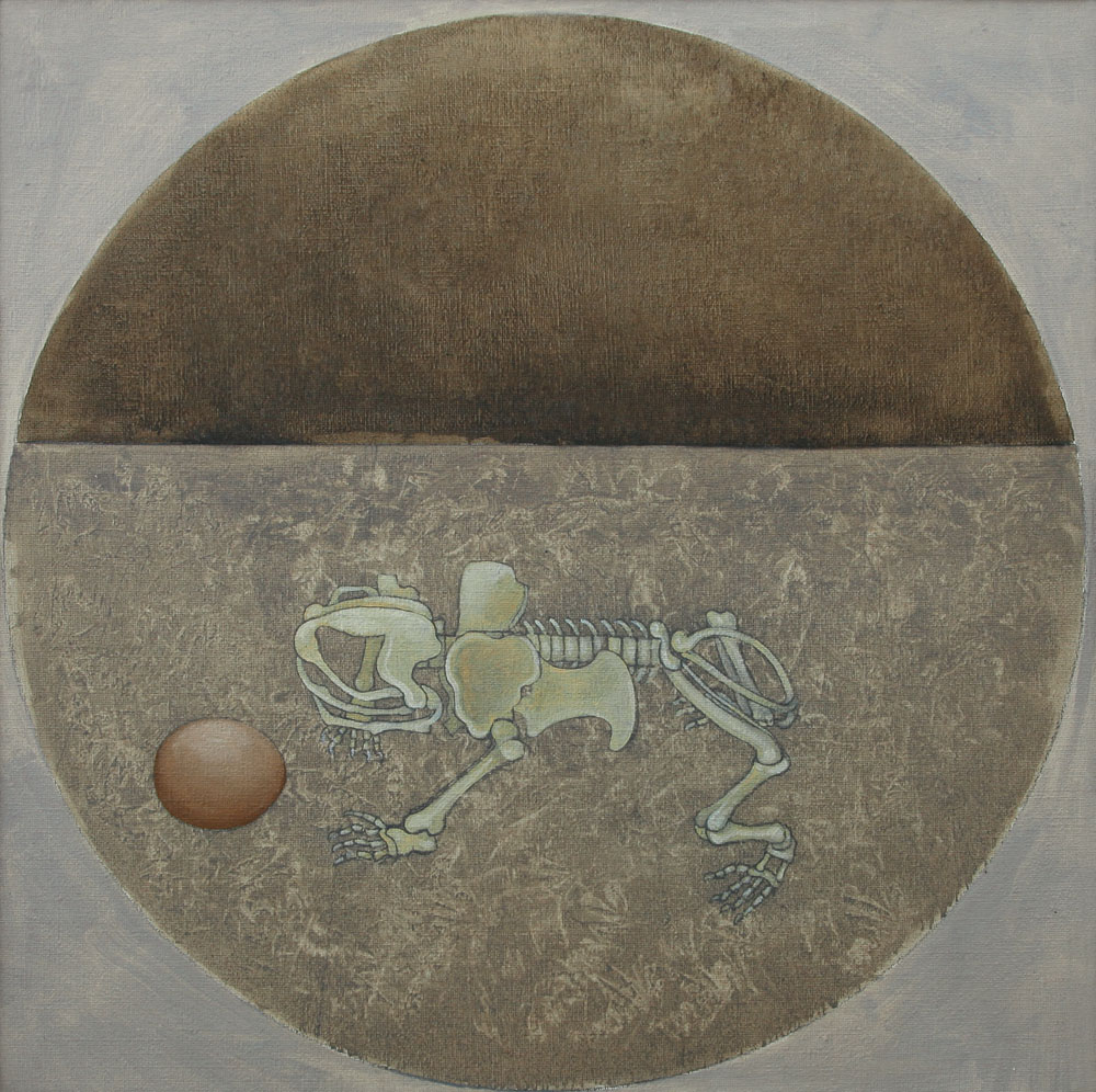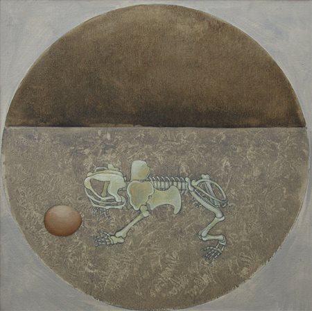 GIOXE DE MICHELI Milano 27/01/1947 - Sul tavolo del maestro, 1974, olio su tela di juta cm. 80x80, firma, titolo e anno al retro.