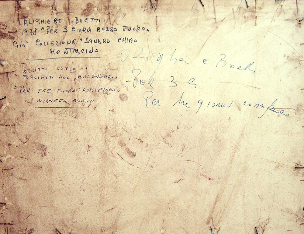 Alighiero Boetti 1940, Torino (To) - 1994, Roma (Rm) - [Italia] Per tre giorni rossofuoco collage e tecnica mista su carta 30x40 cm 1978 firma dell’artista sul retro; opera con cornice; provenienza precedente collezione Sandro Chia certificato di autenticità dell'Archivio Alighiero Boetti con numero di archivio 6501
