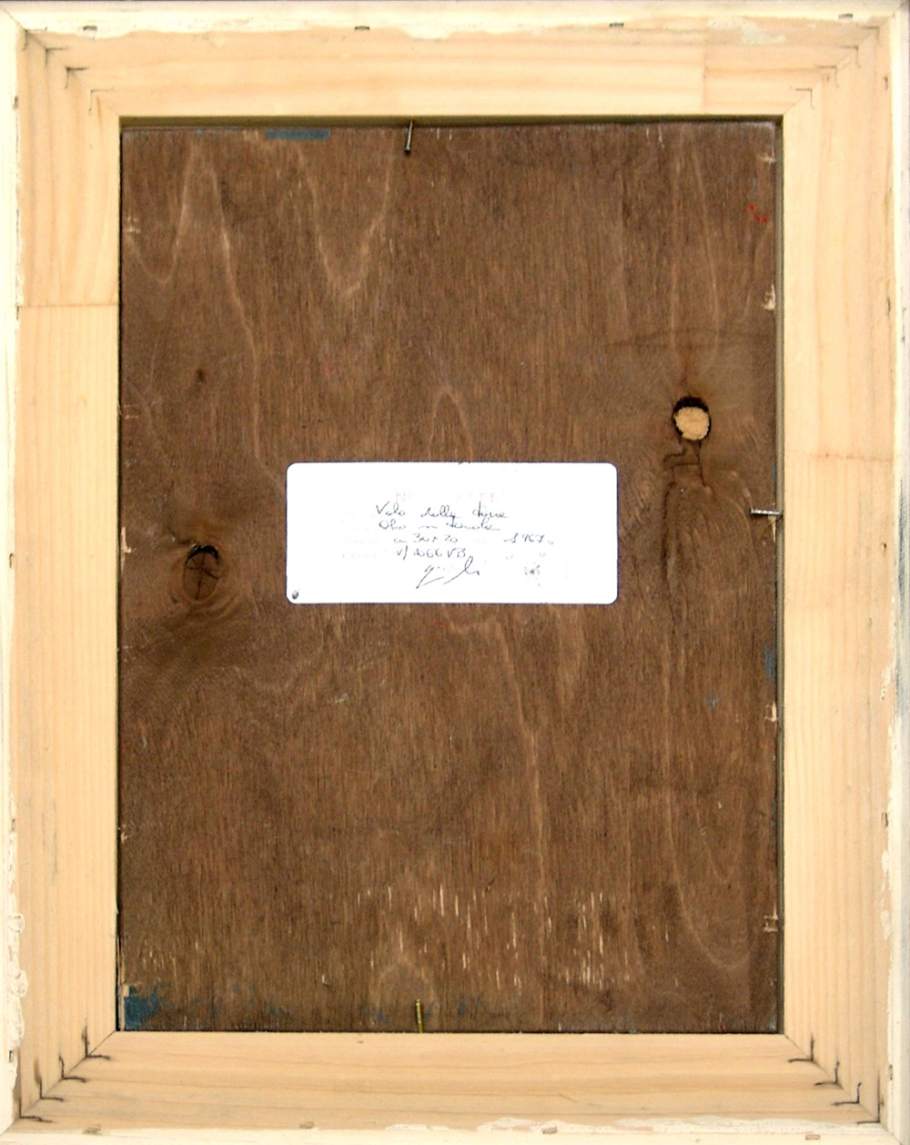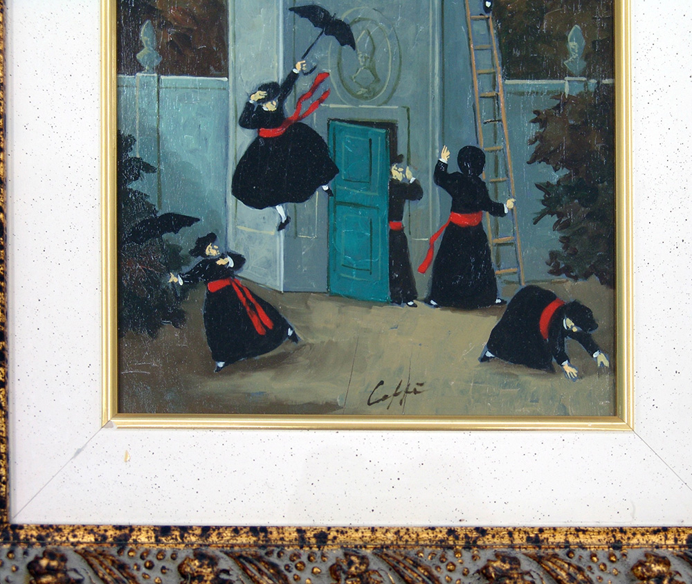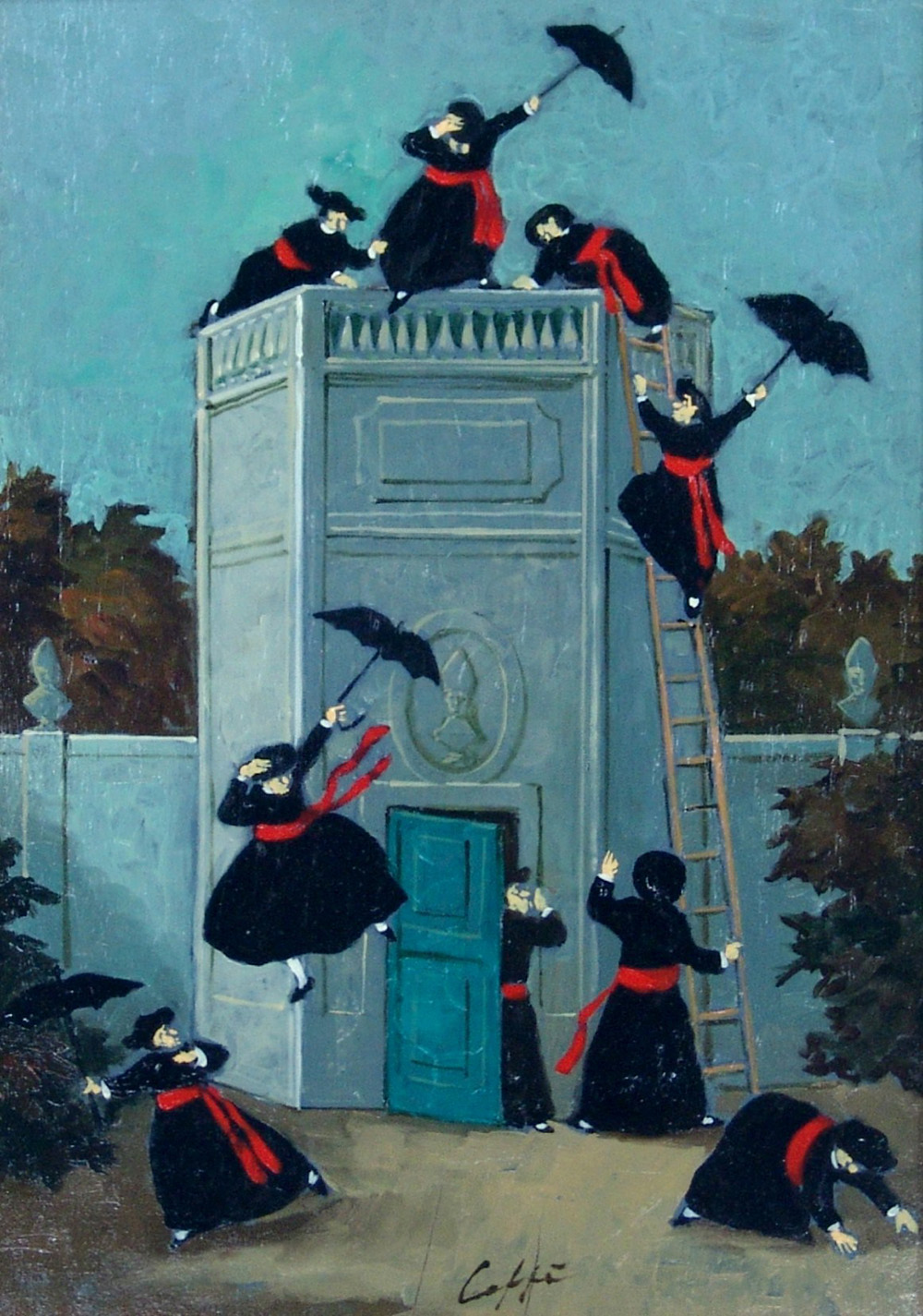 Nino Caffè 1908, Alfedena (Aq) - 1975, Pesaro (Pu) - [Italia] Volo dalla torre olio su tavola 30x20 cm 1967 firma dell'artista in basso al centro; opera con cornice certificato di autenticità Dott. Giorgio Borghi