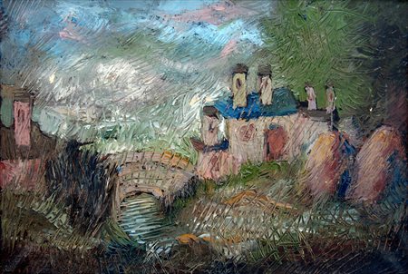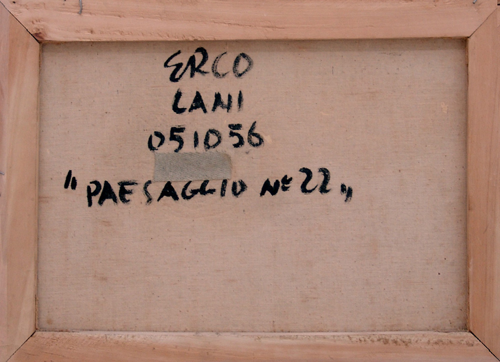 Ernesto Ercolani 1909, Ascoli Piceno (Ap) - 1974, Ascoli Piceno (Ap) - [Italia] Paesaggio n. 22 olio su tela 33x47 cm 1956 firma dell'artista sul retro; opera con cornice certificato di autenticità Picenum